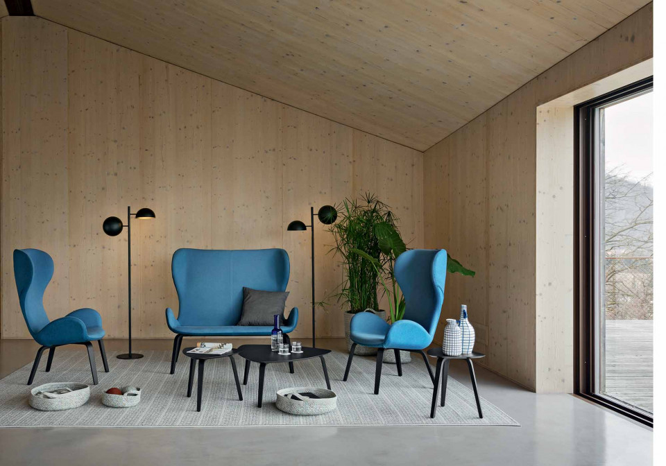 Dalia lounge armchair with high backrest and metal swivel trestle base. Seating is available upholstered in leather, faux leather and fabric. Back and front of backest customizable with different materials and colors.