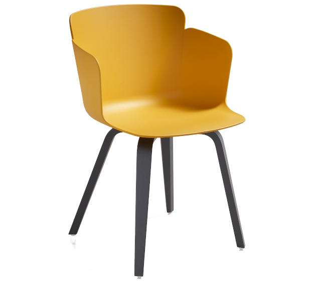 Armchair with four-legs wooden base. Polypropylene shell. Optional: fabric, leather or faux leather cushion.