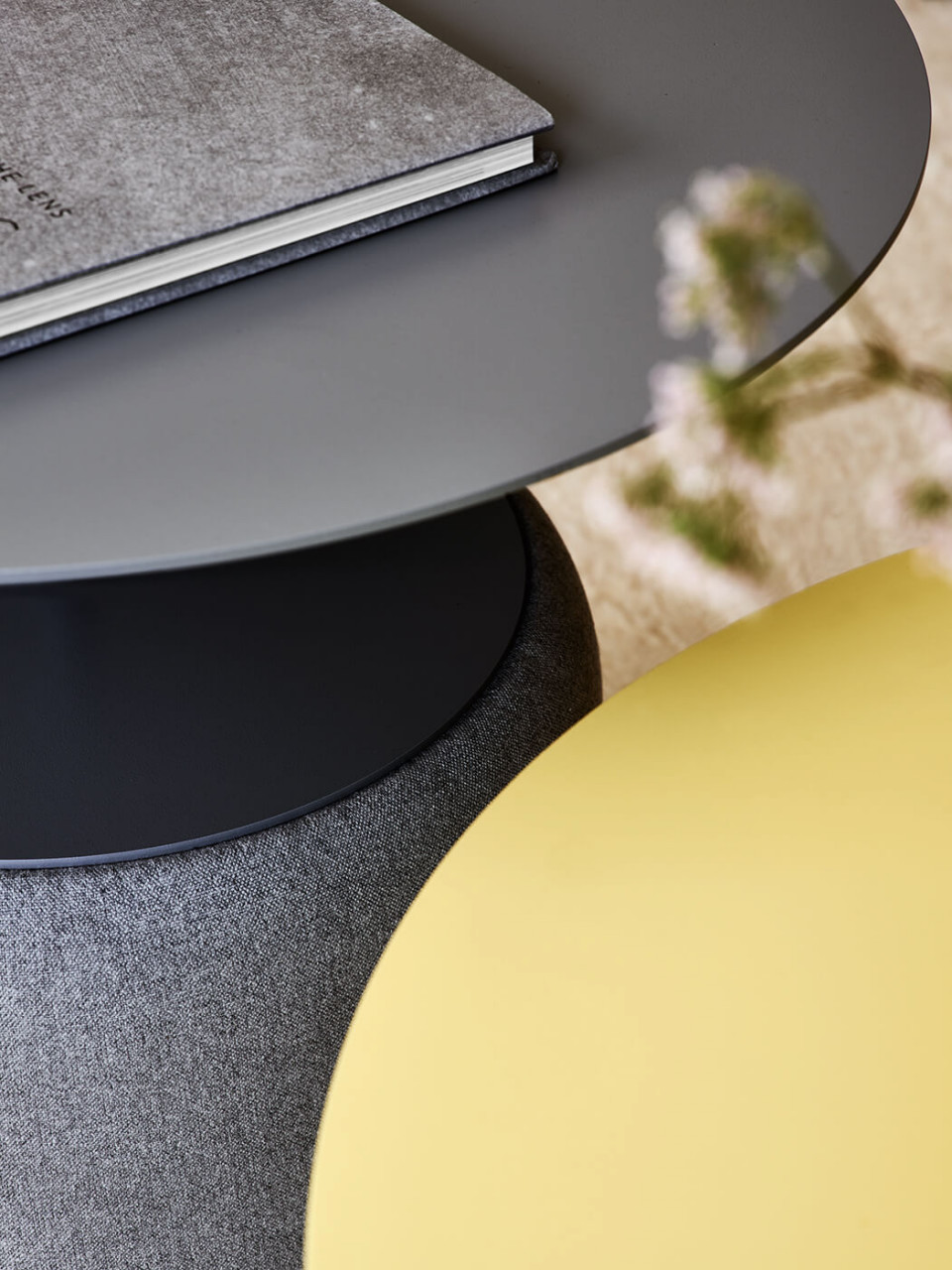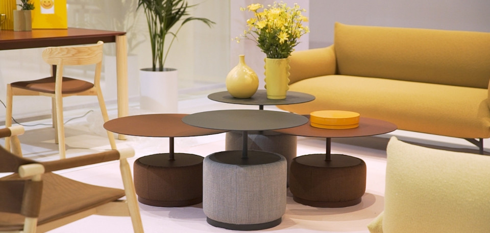 Bloom coffee table is composed of two elements: an original round base upholstered in fabric, leather or faux leather with sound-absorbing action. The top is available in metal or HPL.