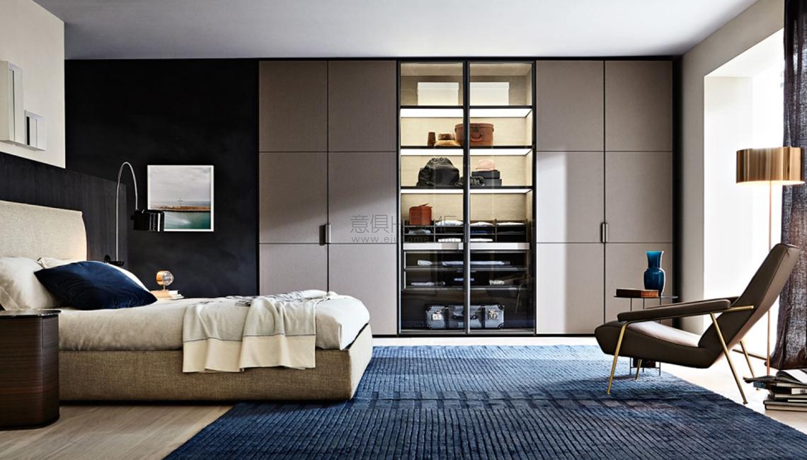 Skin柜門全部用生態(tài)皮革包裹,特殊的鋁制框架在柜門表面分隔出三個方形圖案。