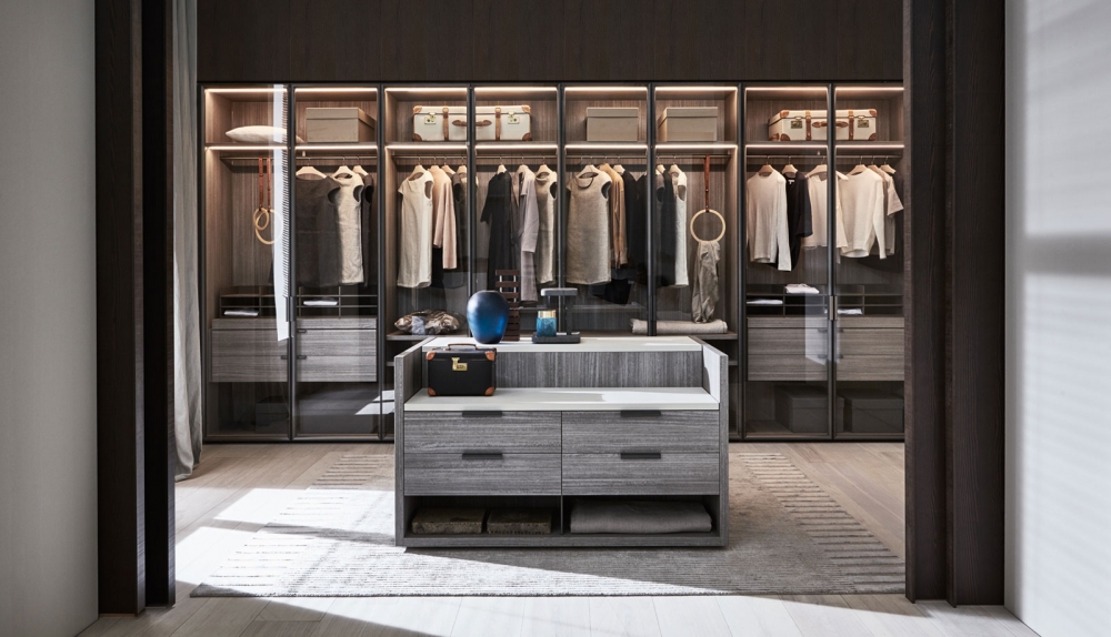 Window是創(chuàng)新設計的鋁框玻璃鉸鏈柜門,錫灰色飾面,帶有側把手。創(chuàng)新的隱藏式鉸鏈安裝在柜體的底板和頂板里面,確保了極其簡潔的視覺效果。