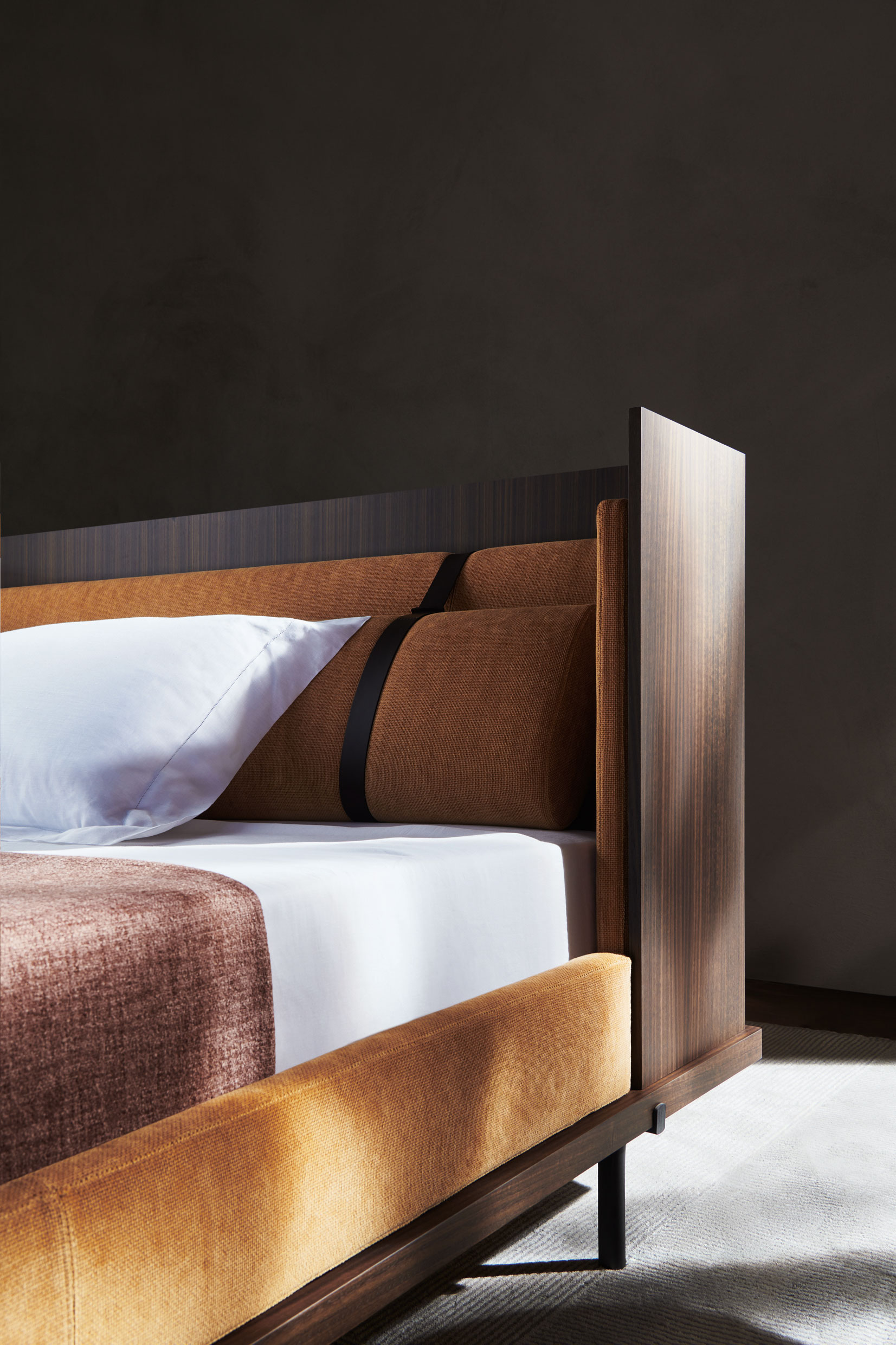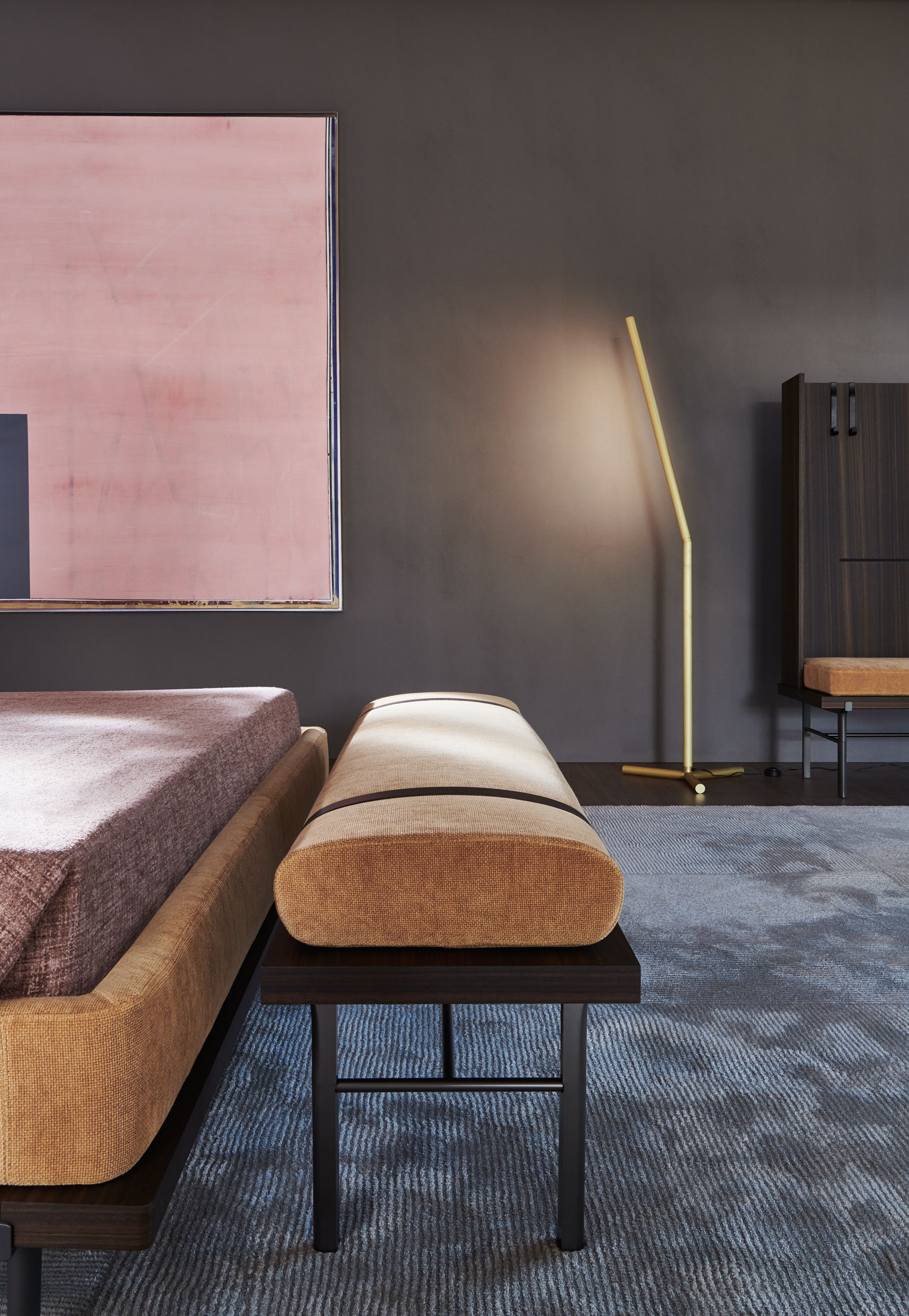 大床的床面為木制,下面由四個(gè)纖細(xì)的金屬支腿支撐,床面的凹槽軟包皮革或針織面 料,可容納各種類(lèi)型的床墊。一張舒適的長(zhǎng)凳沿用了大床的設(shè)計(jì),可以放在床尾,軟墊 像大床一樣通過(guò)皮帶固定?;谌缍髟O(shè)計(jì)研究室的創(chuàng)造力,長(zhǎng)凳反過(guò)來(lái)又變?yōu)閴?mèng)想臥室一件新的配件家具。給長(zhǎng) 凳上添加一個(gè)類(lèi)似大床高床頭的元素,就可以成為一處小的私密空間,可以在換衣服 時(shí)用來(lái)臨時(shí)懸掛或放置一些穿著的衣物。此款配件也搭配有舒適的軟墊,其中的靠墊 通過(guò)皮帶固定,可以移動(dòng),皮帶則插在水平的縫隙之間,為整體增色。