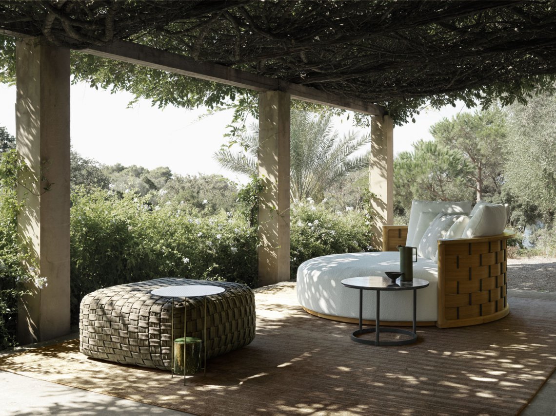 The interaction between the two collections is enhanced in a comfortable pouf, in two sizes, with a woven texture, to complete the accessories proposal of the Timeout Collection.