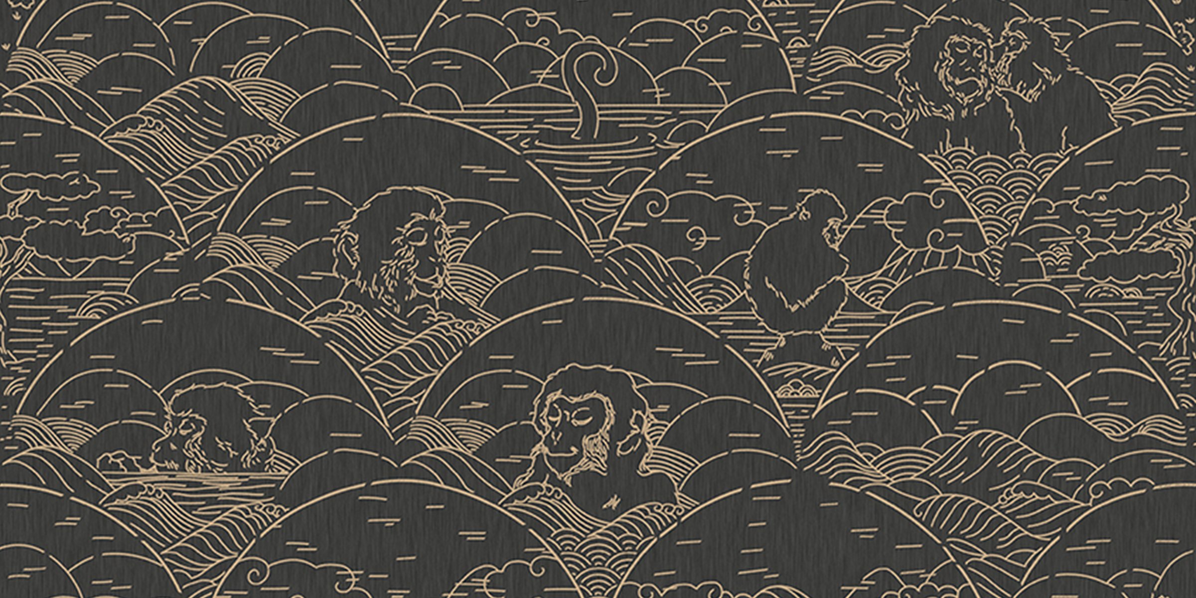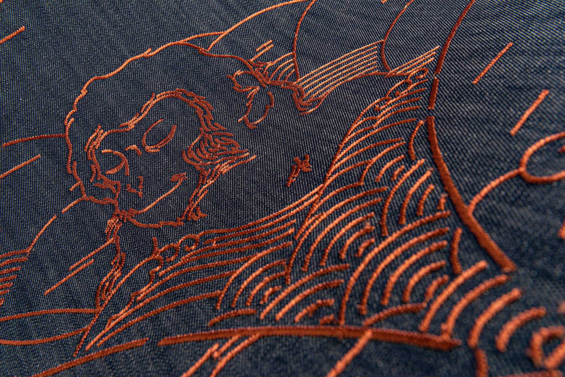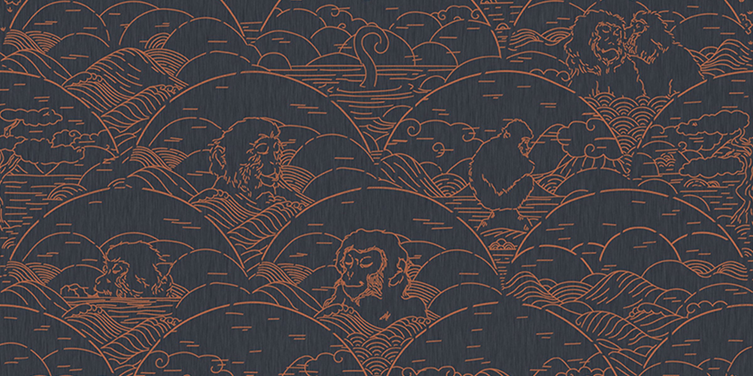 Textile wallcovering made from denim, with coloured embroidery. The design on the Indigo Macaque wallcovering displays a playful scene of Indigo Macaque families bathing in their favourite relaxing spot: the hot springs at the foot of the Japanese mountains.