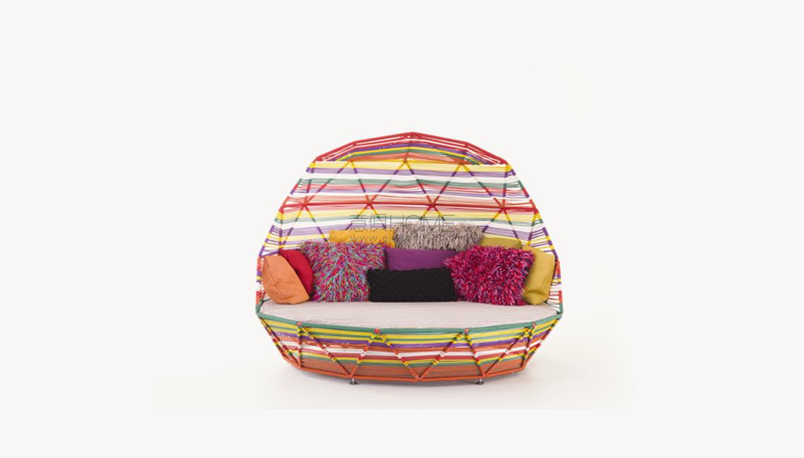 Struttura in acciaio verniciato rosso RAL 3020 e intreccio in filo tecnopolimero multicolor. Il materasso del Day bed è in poliuretano espanso adatto per l’esterno; i cuscini sono in fibra poliestere per uso esterno. La collezione viene fornita di cuscini.