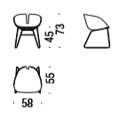 Scocche in espanso schiumato a freddo ignifugo con struttura interna in acciaio rivestito in tessuto o pelle. Basi in acciaio inox a slitta con poggiapiedi.