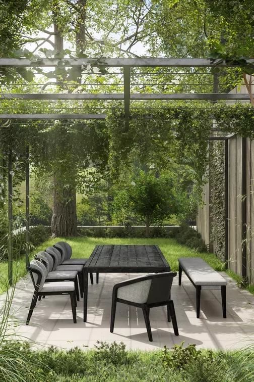 Clean lines and strong curves give Sunrise an undeniably compelling posture, while the warmth of its materials and openness of its frame form an irresistible invitation for endless moments of outdoor enjoyment. Available in warm brushed teak and bold teak scuro, Sunrise includes a complete range of both lounge and dining furniture. Dark teak details and a backrest upholstered in fabric or batyline? complete the design of this robust yet elegant teak collection by Matthew Townsend. From countryside residence to avant-garde hotel or even a futuristic yacht, Sunrise’s versatility makes it a captivating addition to any environment.