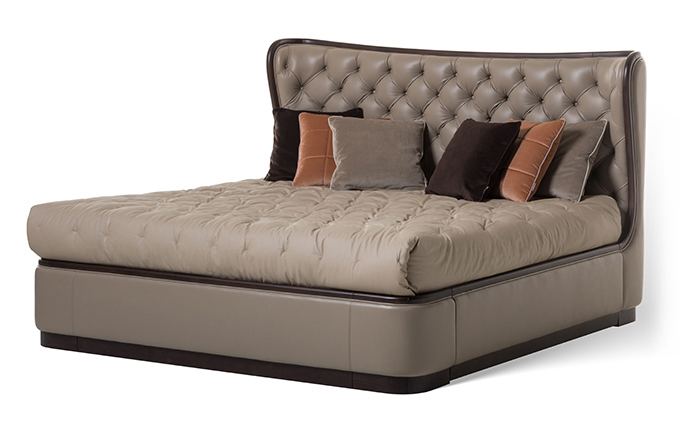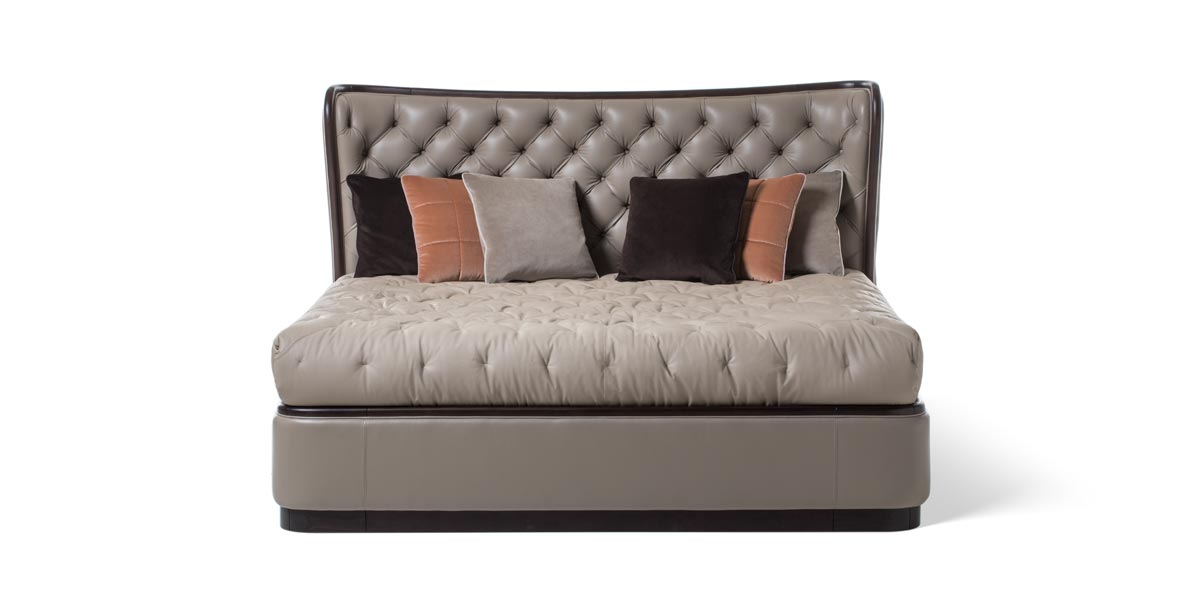 Bed with wooden structure and upholstered headboard with capitonè finish. Basement in wood.