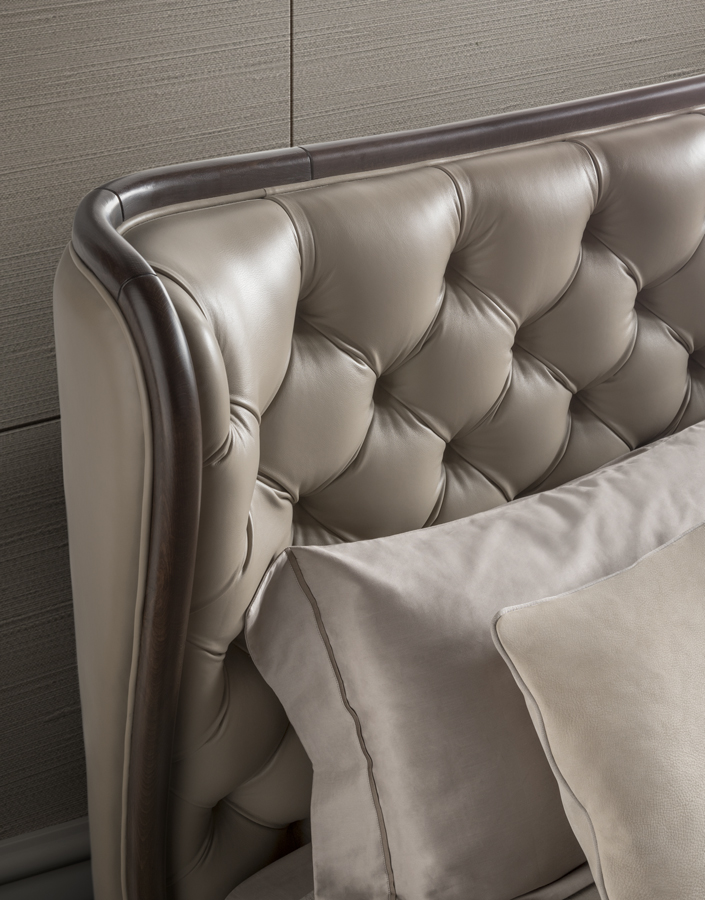 Letto con struttura in legno e testata imbottita con finitura capitonè. Basamento in legno.