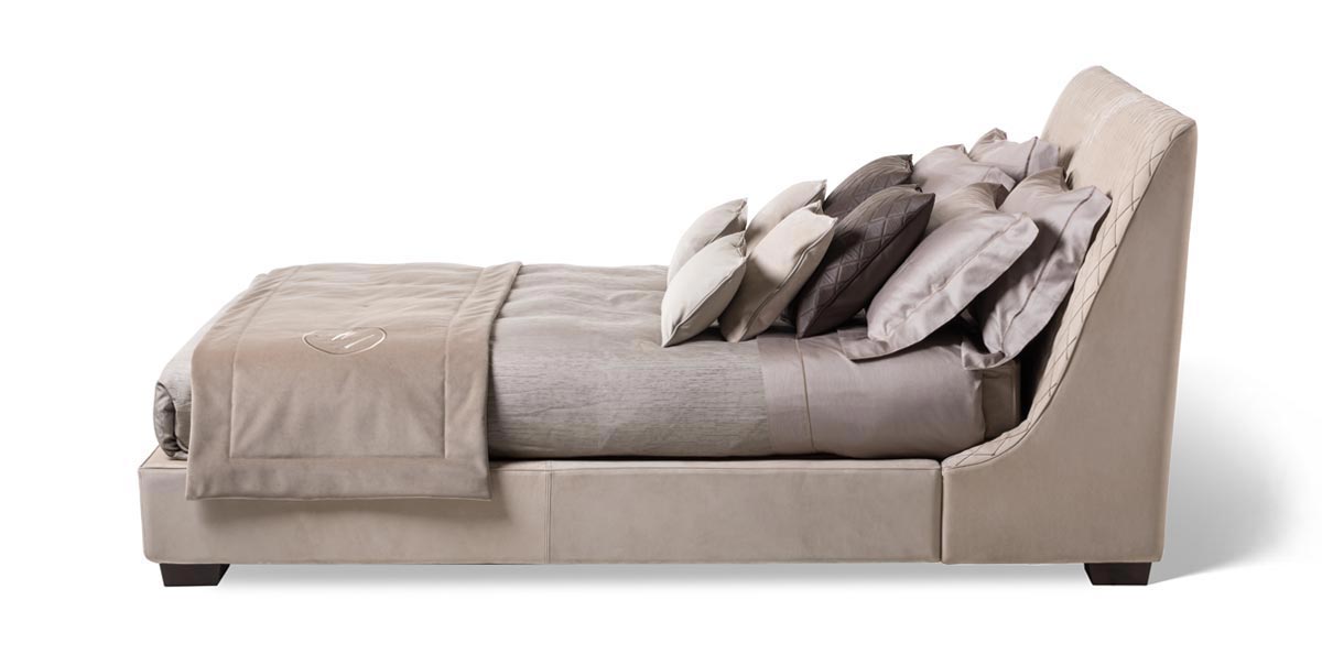 Letto imbottito con piedini in legno. Rivestimento in tessuto o pelle.