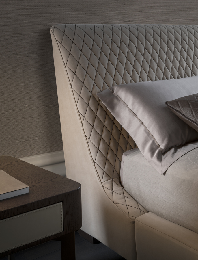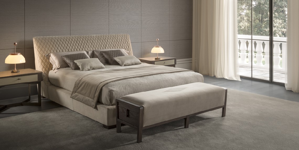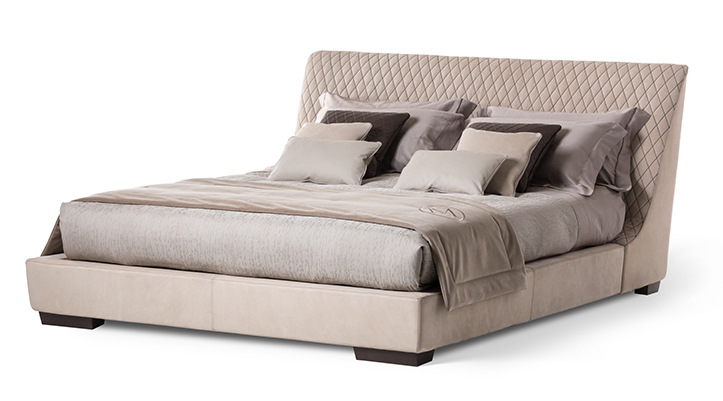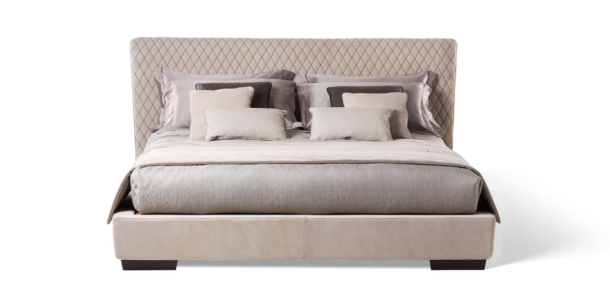Upholstered bed with wooden feet. Upholstery in fabric or leather.