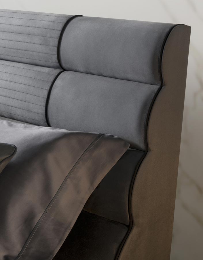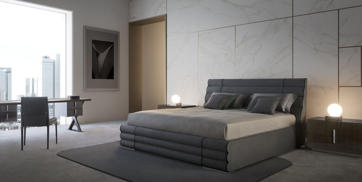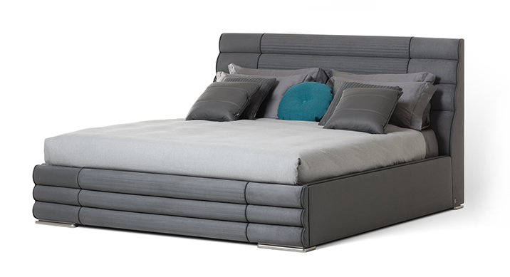 Letto imbottito con piedi laccato color argento satinato. Rivestimento tessuto o pelle.