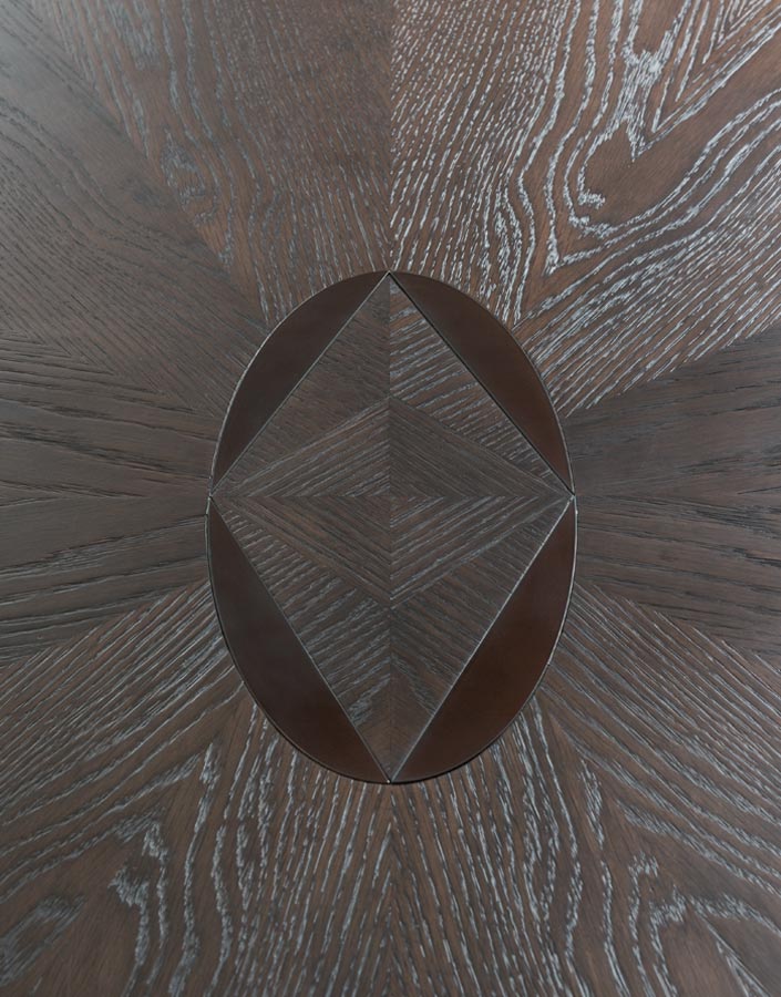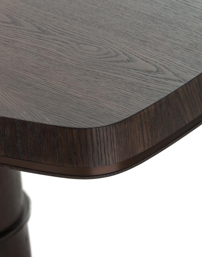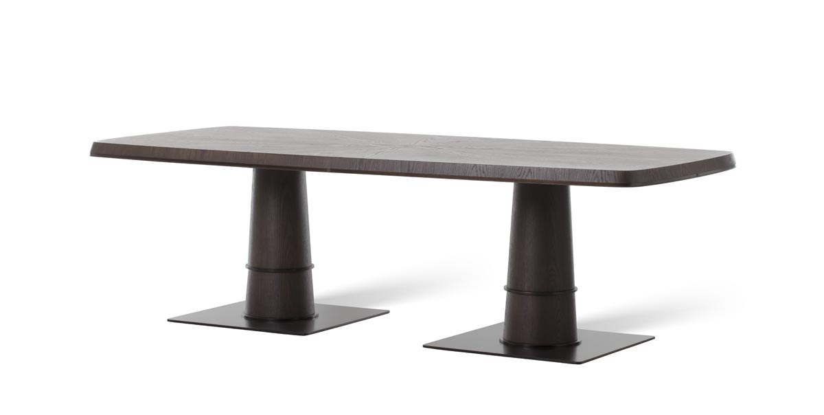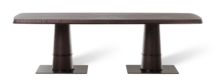 Tavolo rettangolare con piano in legno, inserti in metallo e base in metallo.