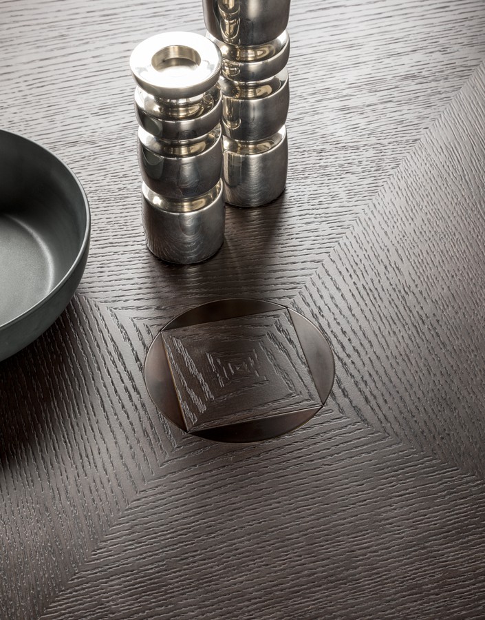 Tavolo rotondo con piano in legno, inserti in metallo e base in metallo.