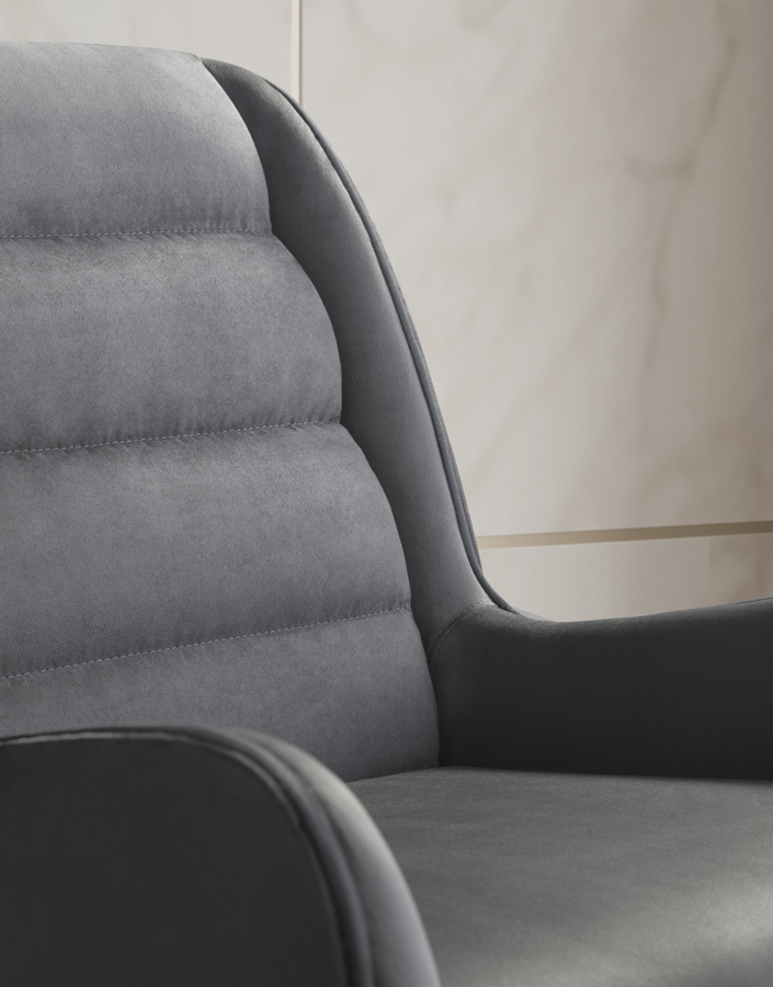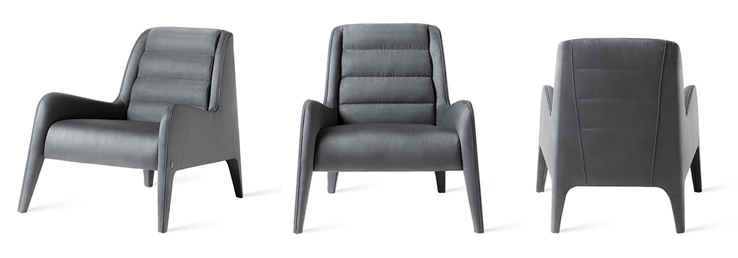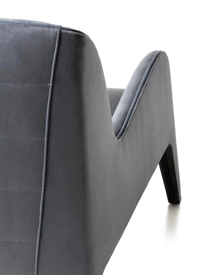 Poltrona imbottita rivestita in tessuto o in pelle. Gambe rivestite con tessuto o pelle.