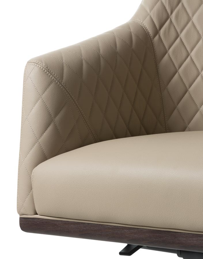 Poltrona girevole con struttura in legno e base in metallo. Rivestimento in tessuto o pelle.