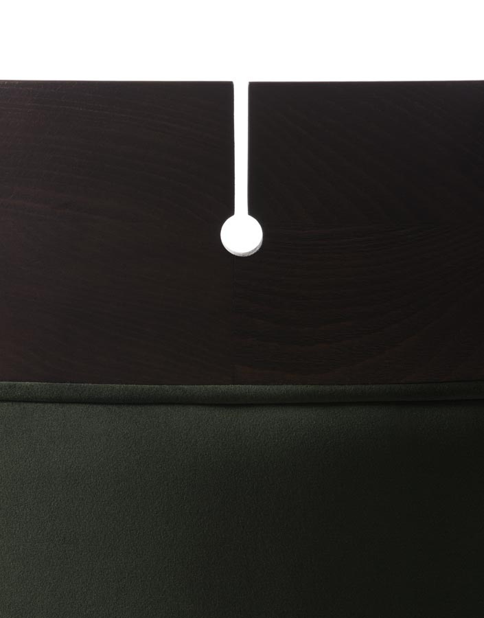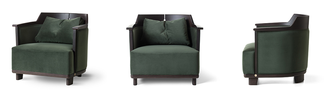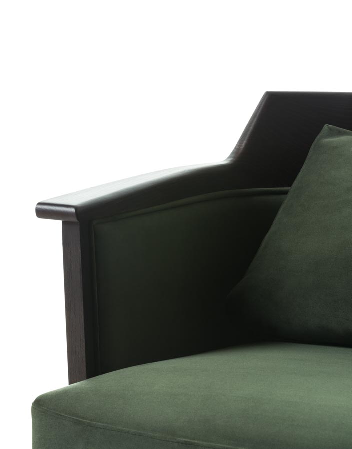 Poltrona con struttura in legno, rivestimento in tessuto o pelle.