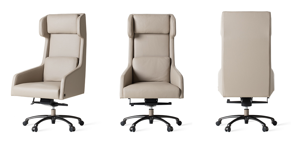 Poltrona girevole imbottita. Rivestimento in tessuto o pelle.