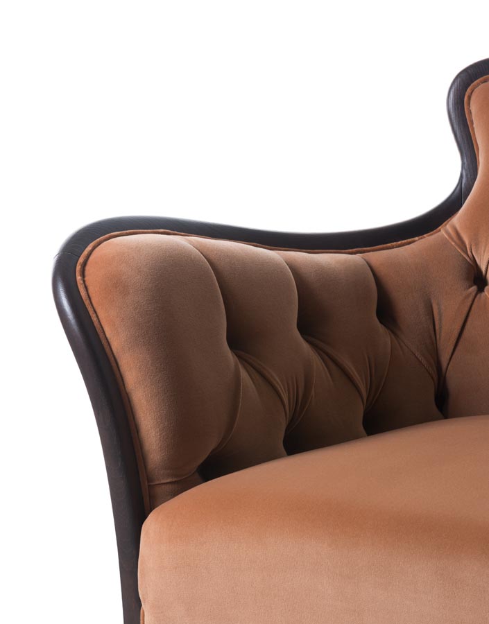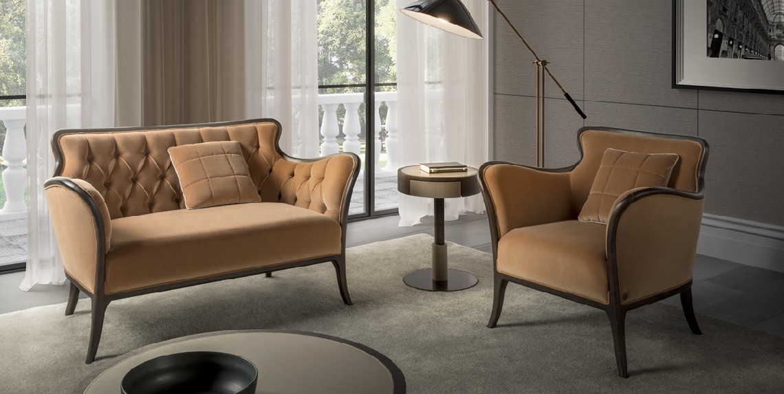 Sofa with wooden structure, plain seat and capitonè backseat. Upholstery in fabric or leather.
