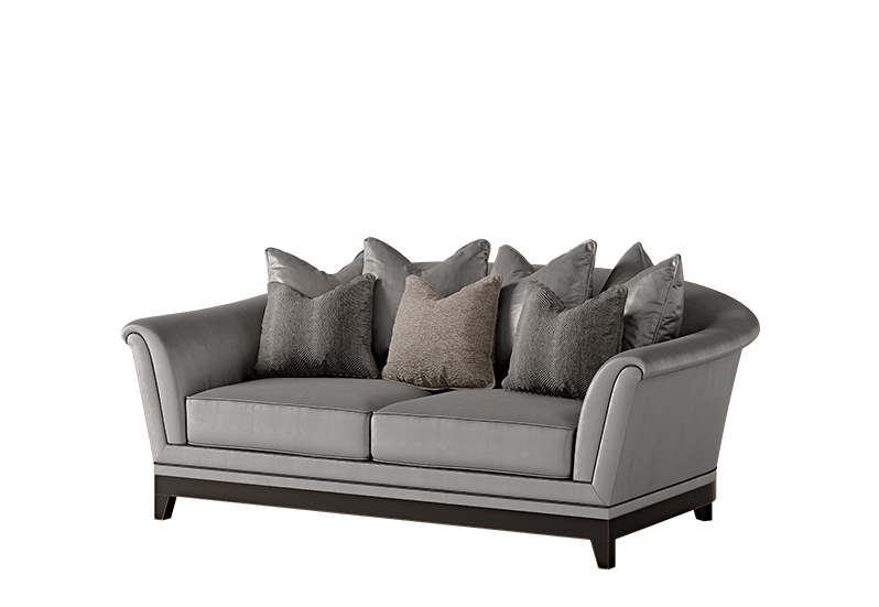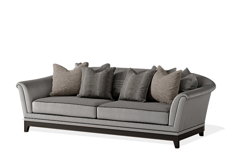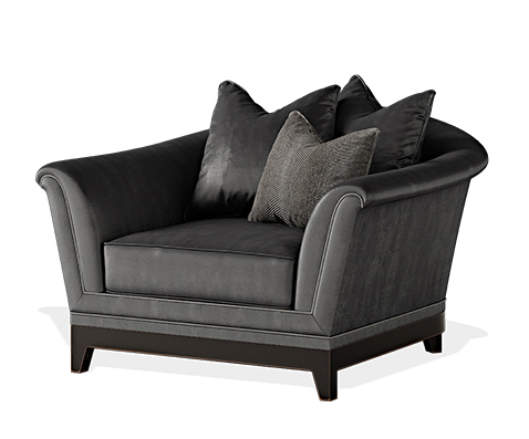 Poltrona. Struttura in legno massello completamente imbottita. Rivestimento in tessuto o pelle.Basamento in legno con finitura Ebanizzazione. Cuscinetti decorativi.