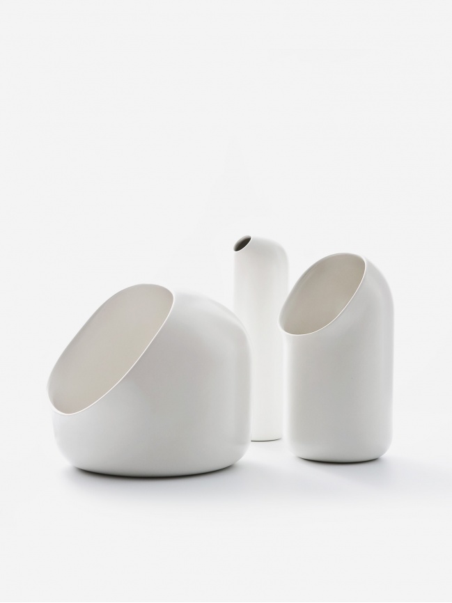 ? is a family of accessories made out of clay and compound by a vase, a jug and a basket. Alone or as a trio, always expressives, they seem to sing, scream their lungs out or chat ... Stocky, slim or plump ... Their morphology is very singular but they are linked by a generous and strong look.