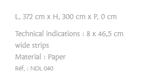 Printed non-woven paper, each decoration measures 372 x 300 cm and is presented as 8 strips to gather, easily to stick on the wall (with a special non-woven glue). All decorations can be cut again from height and width to be adapted to all wall dimensions.