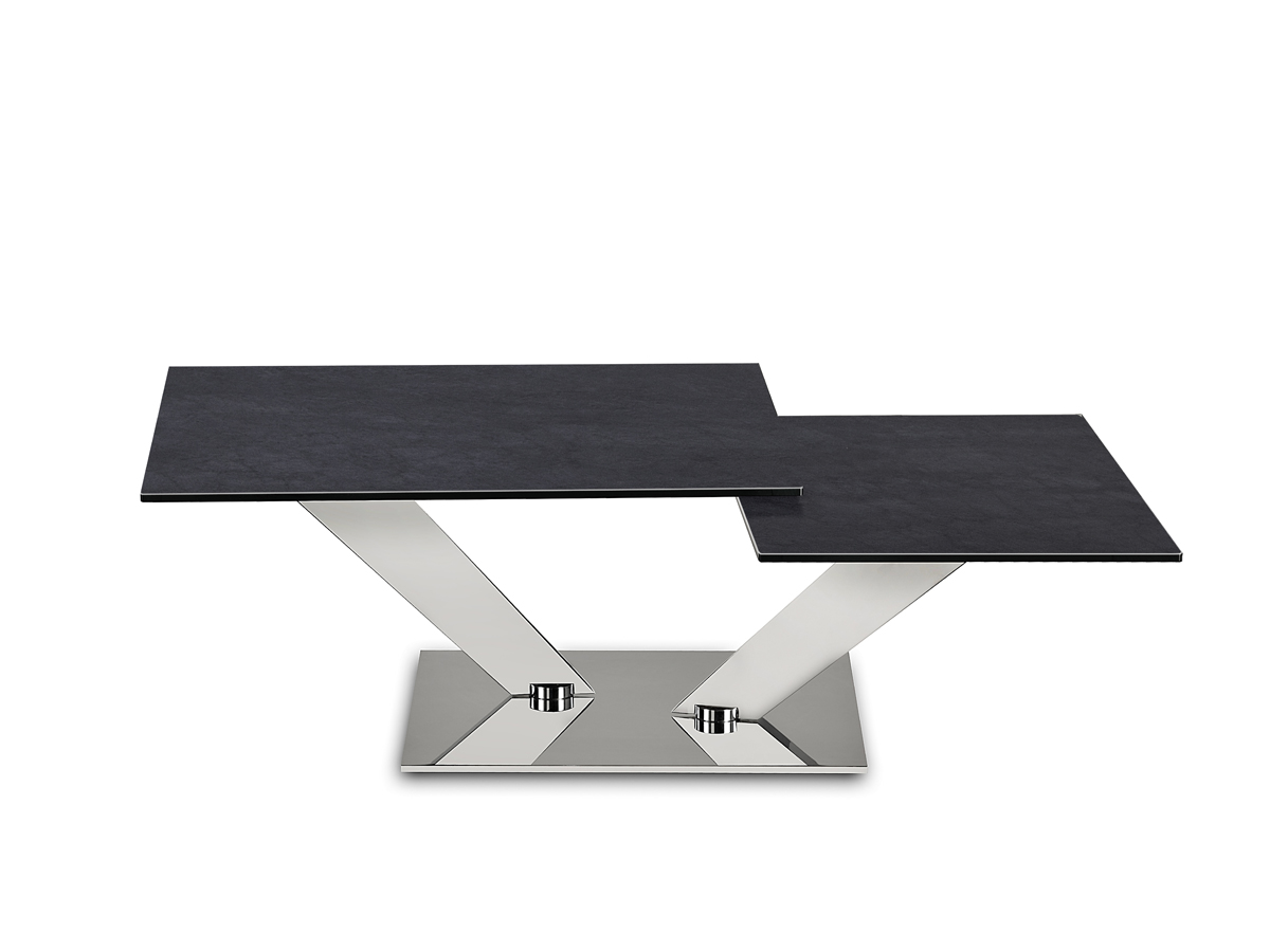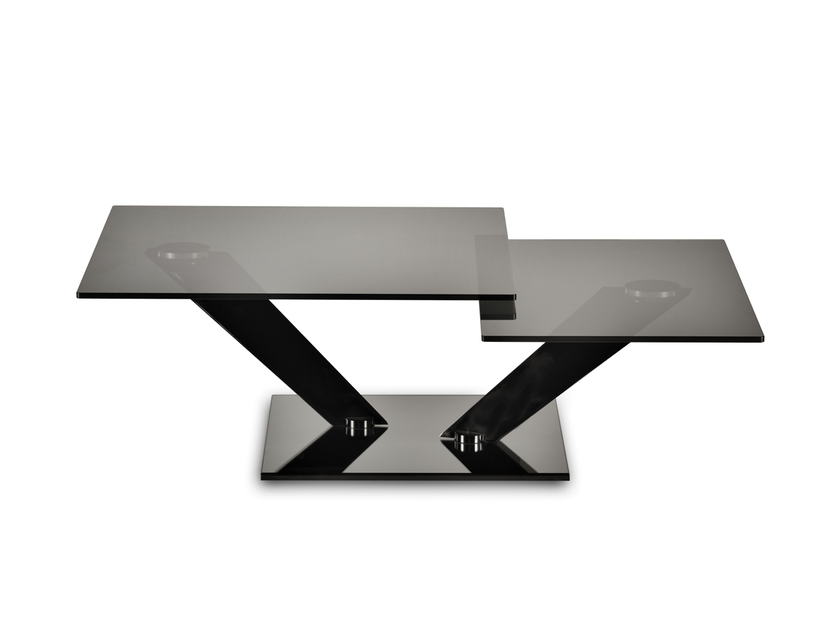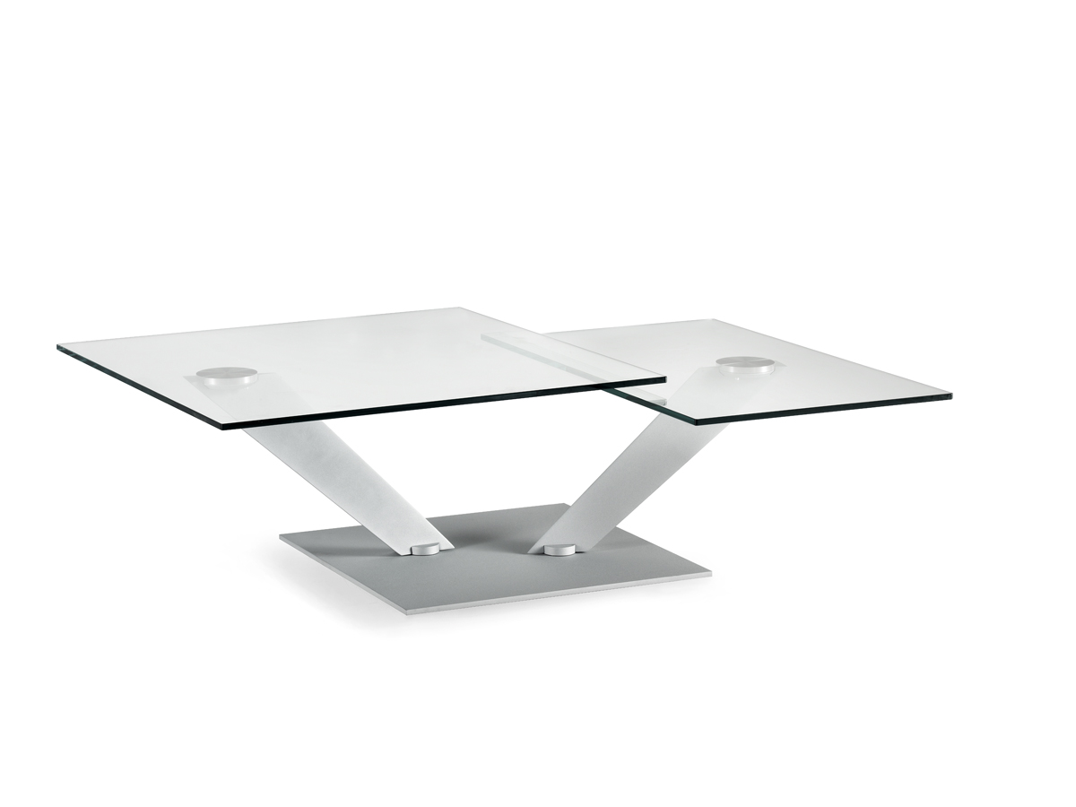 TAVOLINO ESTENSIBILE CON PIANI GIREVOLI SINCRONIZZATI IN CRISTALLO. BASE E SUPPORTI IN ACCIAIO VERNICIATO O GALVANIZZATO. DISPONIBILE ANCHE CON BASE IN CERAMICA, CRISTALLO VERNICIATO O SPECCHIO. PIANI DISPONIBILI IN CERAMICA O IL SOLO PIANO SUPERIORE IN ROVERE.