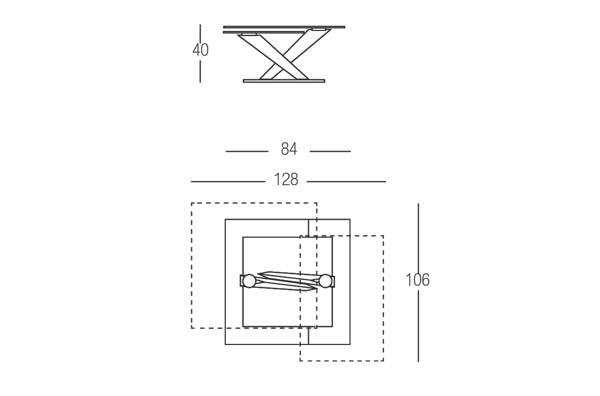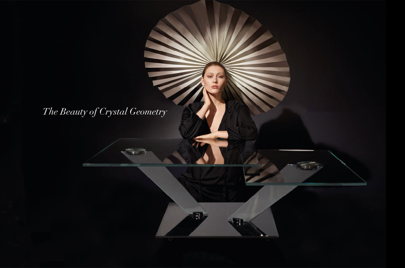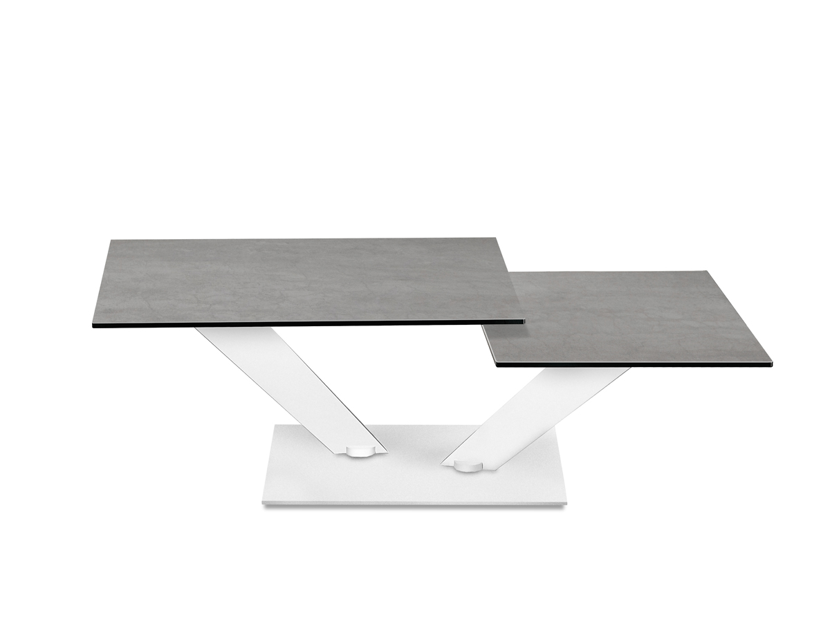 TAVOLINO ESTENSIBILE CON PIANI GIREVOLI SINCRONIZZATI IN CRISTALLO. BASE E SUPPORTI IN ACCIAIO VERNICIATO O GALVANIZZATO. DISPONIBILE ANCHE CON BASE IN CERAMICA, CRISTALLO VERNICIATO O SPECCHIO. PIANI DISPONIBILI IN CERAMICA O IL SOLO PIANO SUPERIORE IN ROVERE.