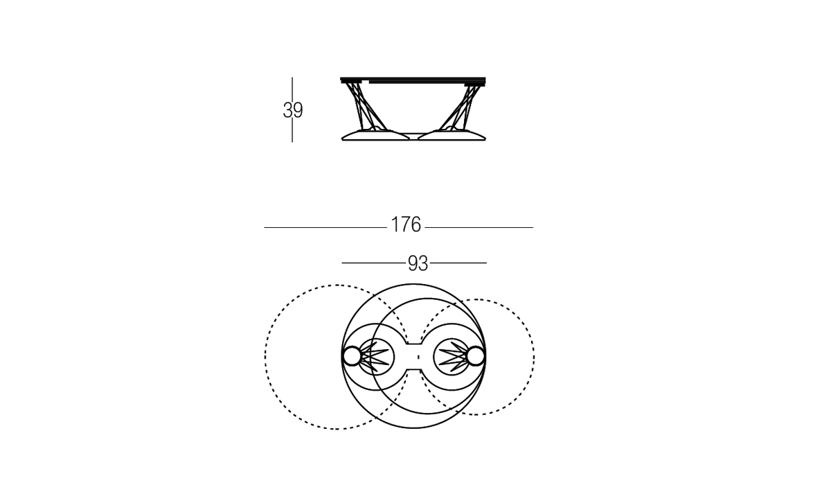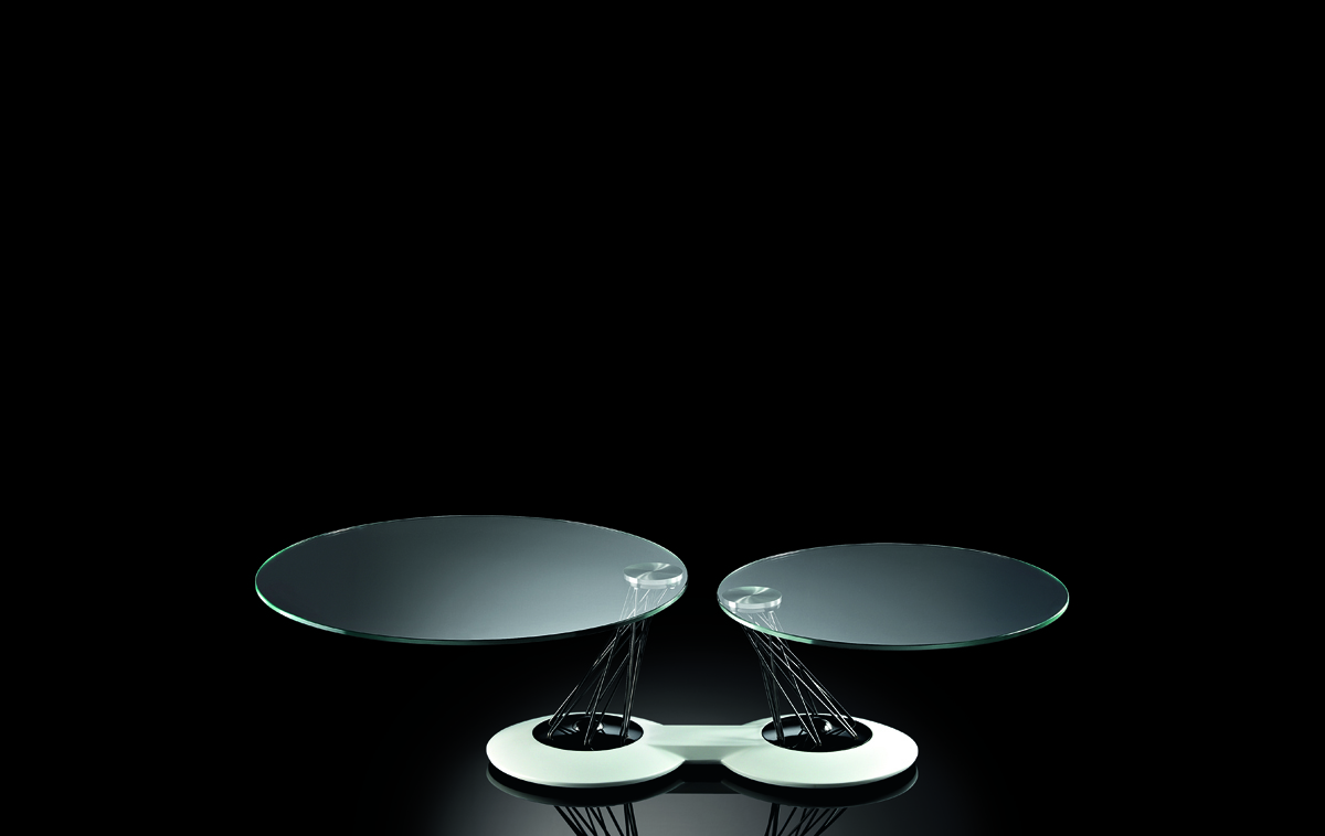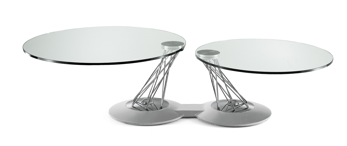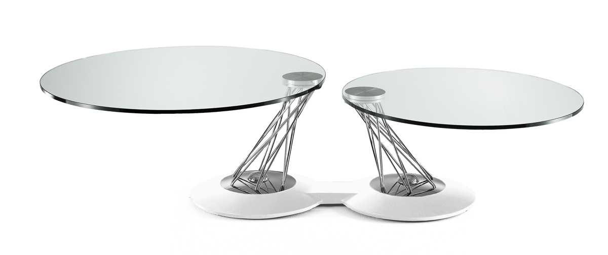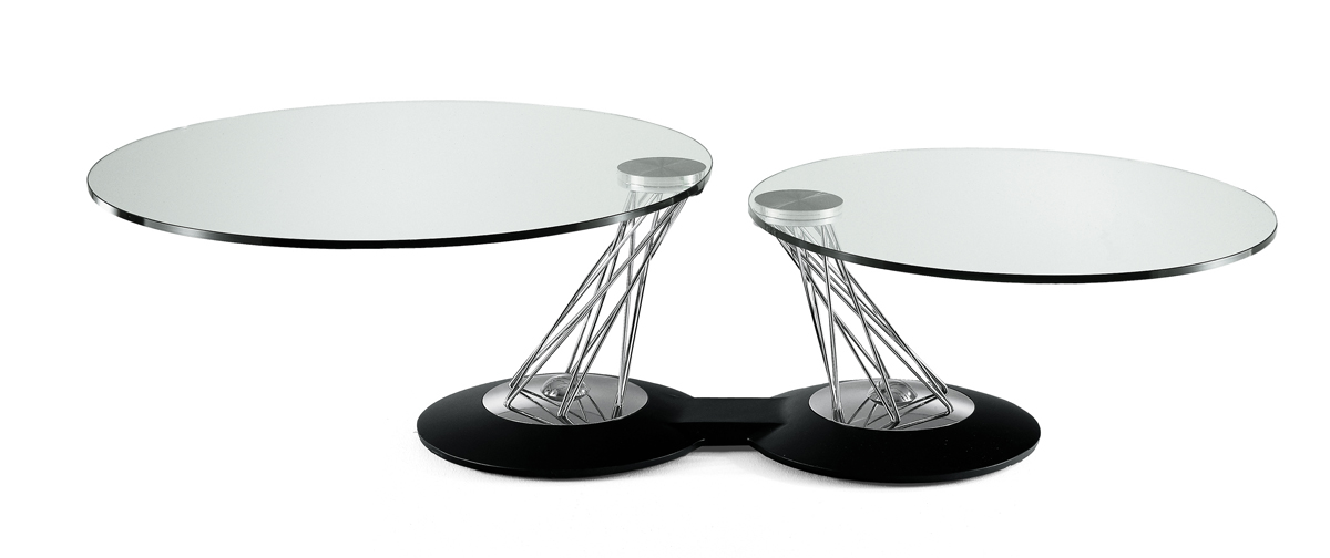 TAVOLINO ESTENSIBILE CON PIANI GIREVOLI SINCRONIZZATI IN CRISTALLO. BASE IN ACCIAIO RIVESTITA DI MATERIALE SINTETICO VERNICIATO. SUPPORTI IN ACCIAIO GALVANIZZATO.