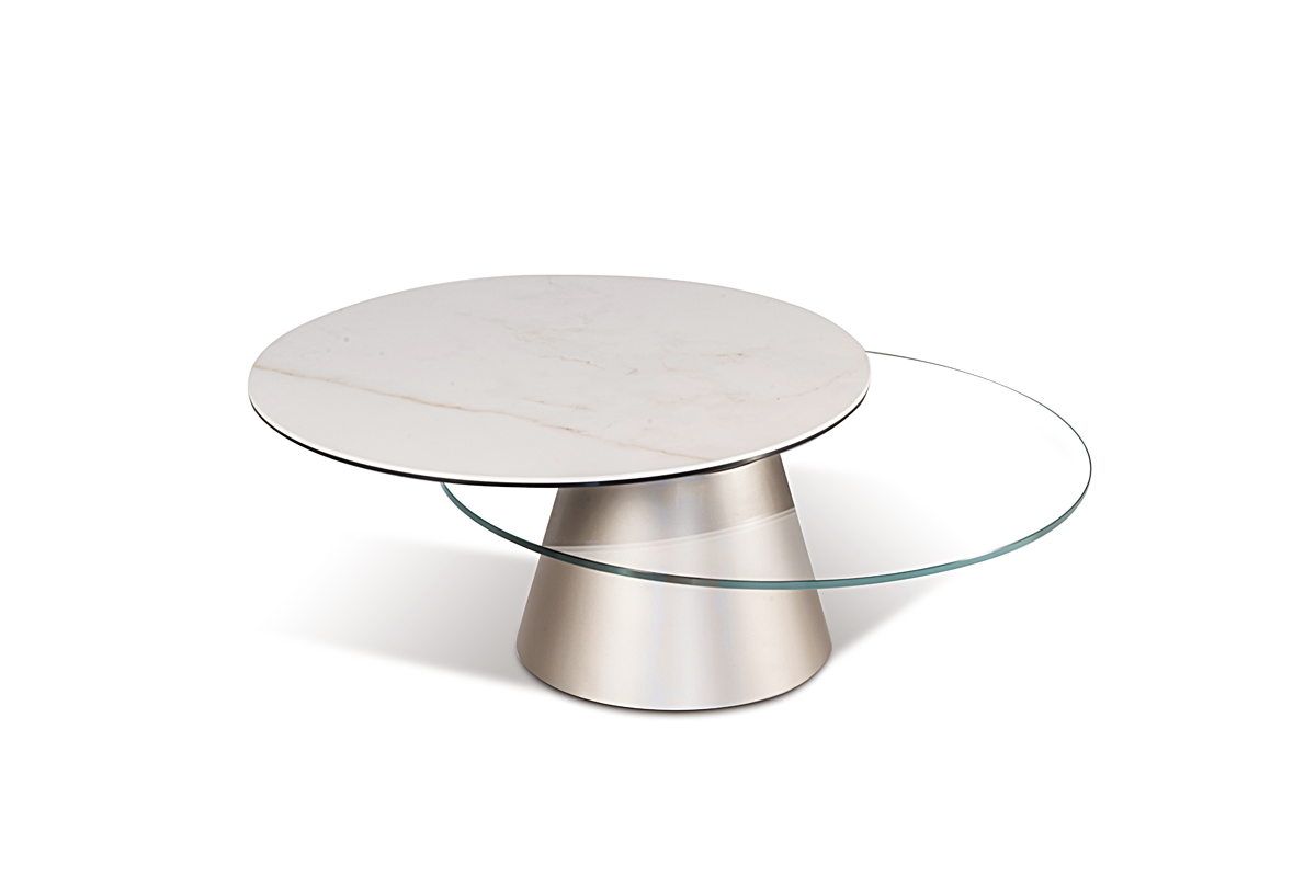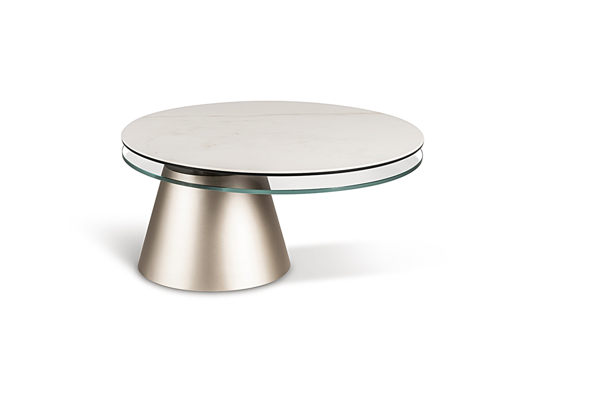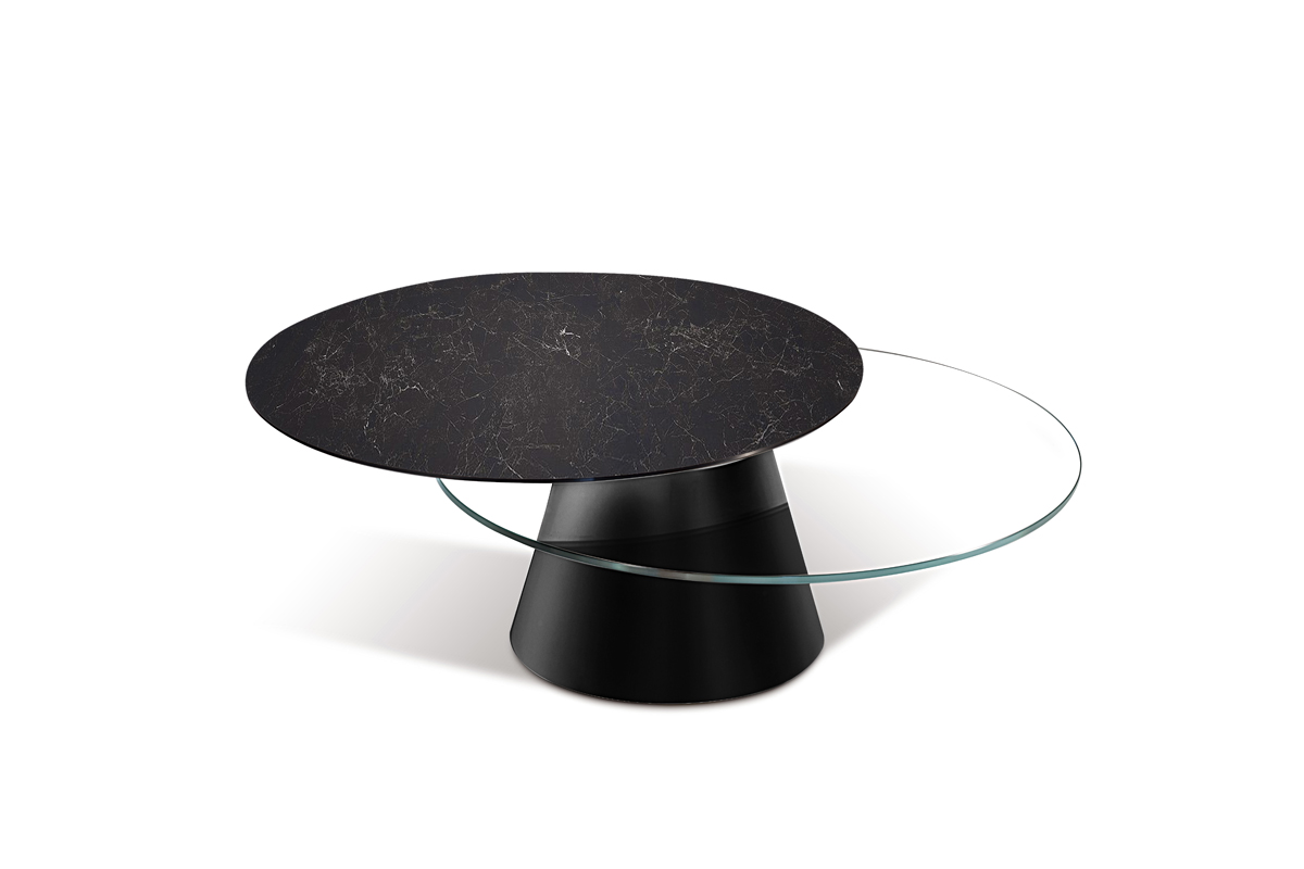TAVOLINO ESTENSIBILE CON PIANI GIREVOLI SINCRONIZZATI. BASE IN ACCIAIO VERNICIATO. PIANO SUPERIORE IN CERAMICA E PIANO INFERIORE IN CRISTALLO O CERAMICA.