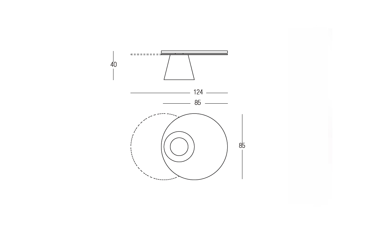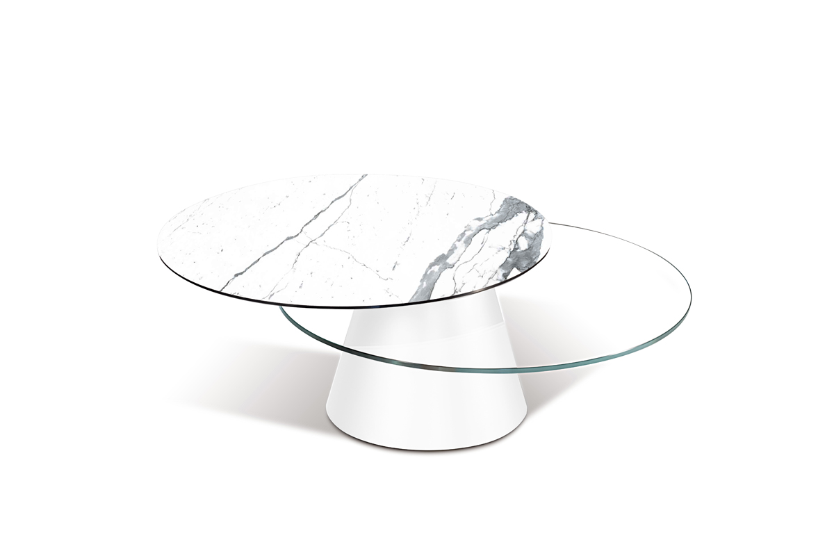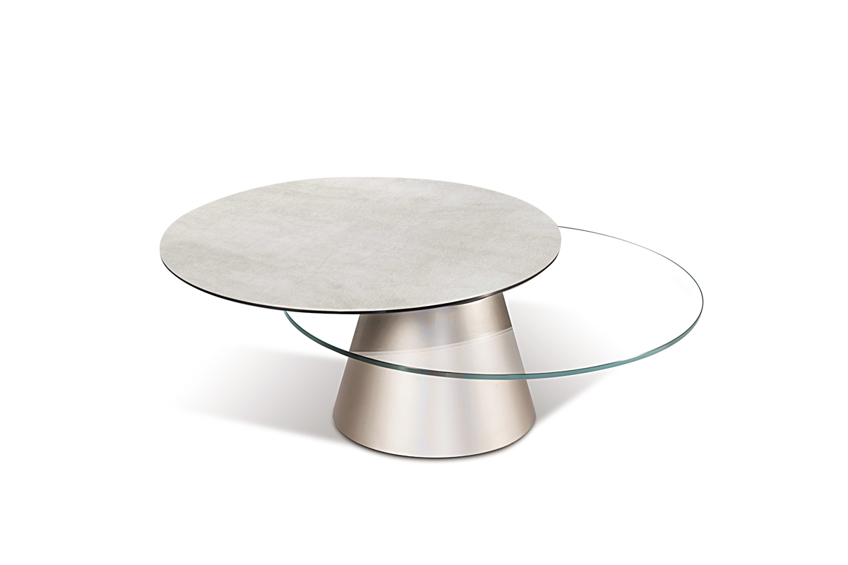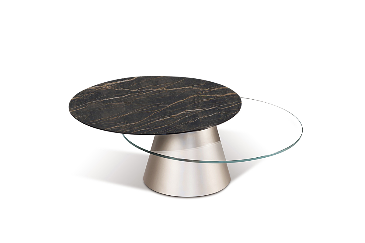 TAVOLINO ESTENSIBILE CON PIANI GIREVOLI SINCRONIZZATI. BASE IN ACCIAIO VERNICIATO. PIANO SUPERIORE IN CERAMICA E PIANO INFERIORE IN CRISTALLO O CERAMICA.