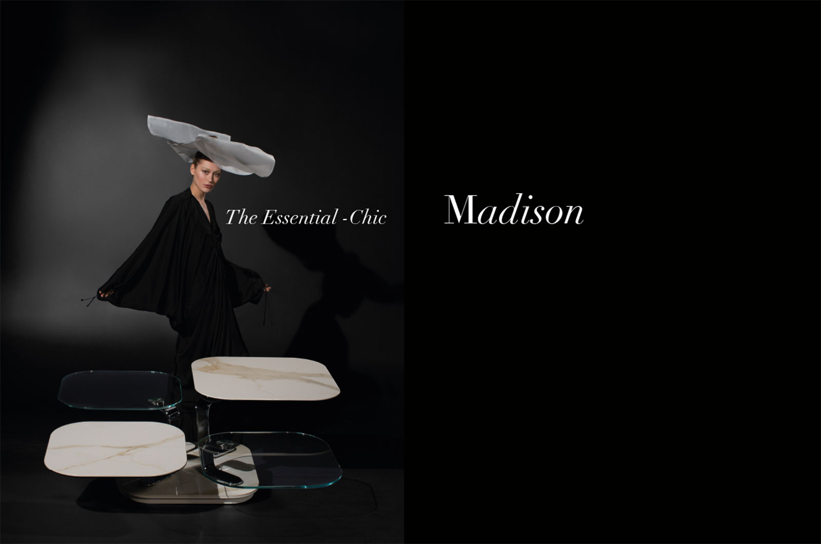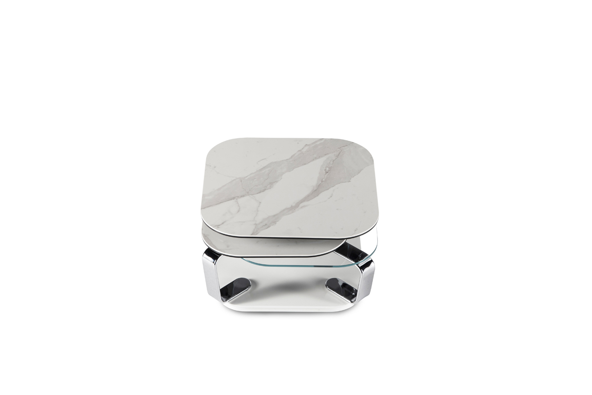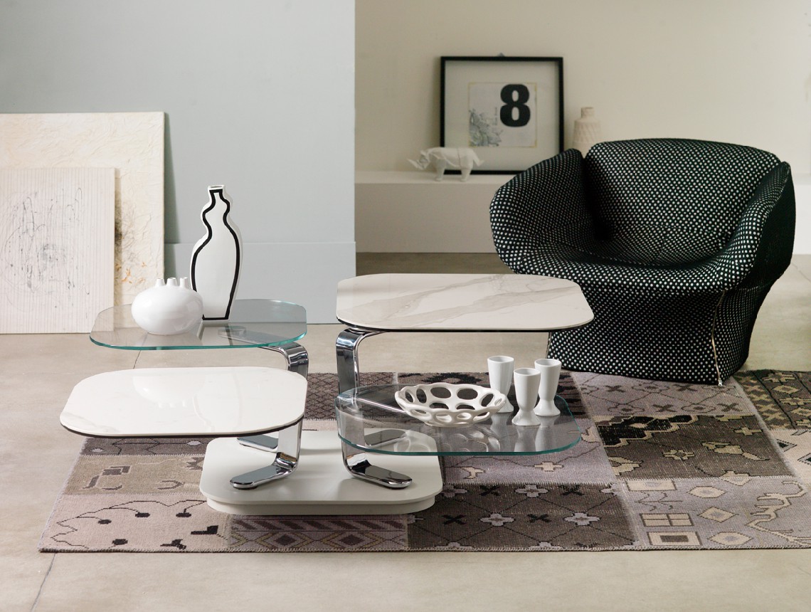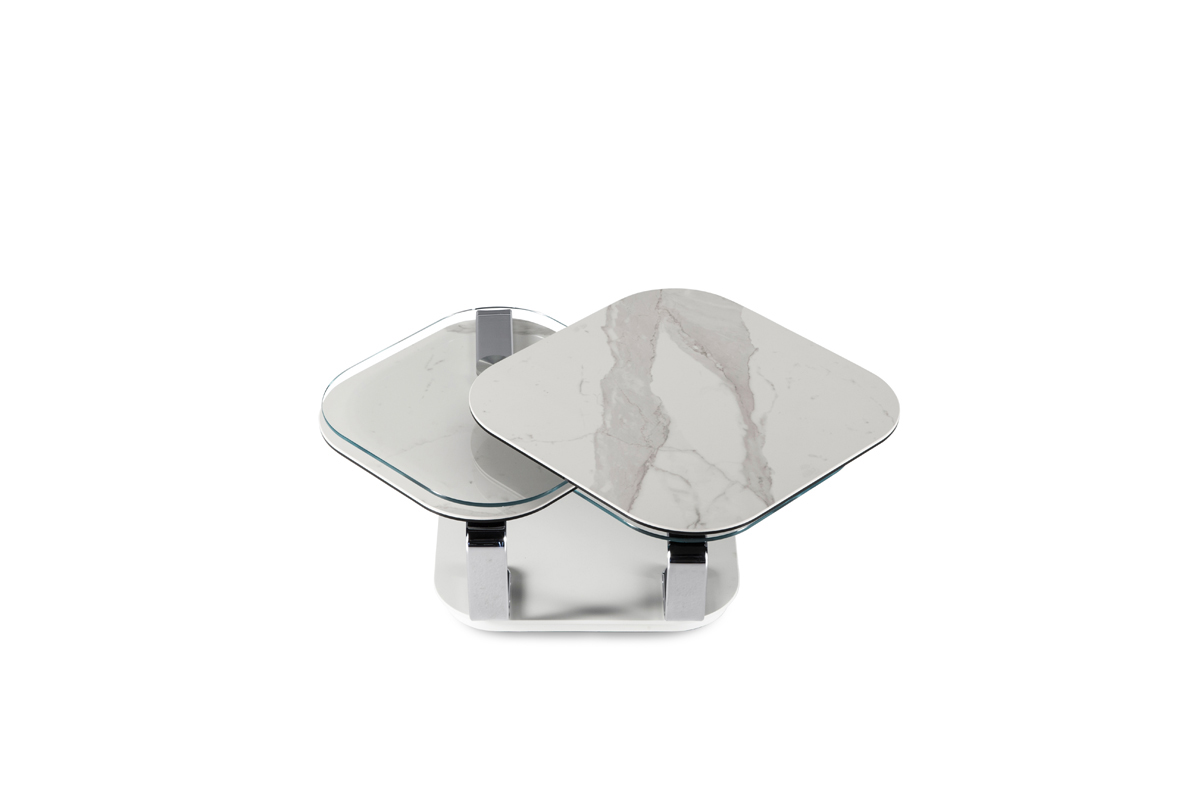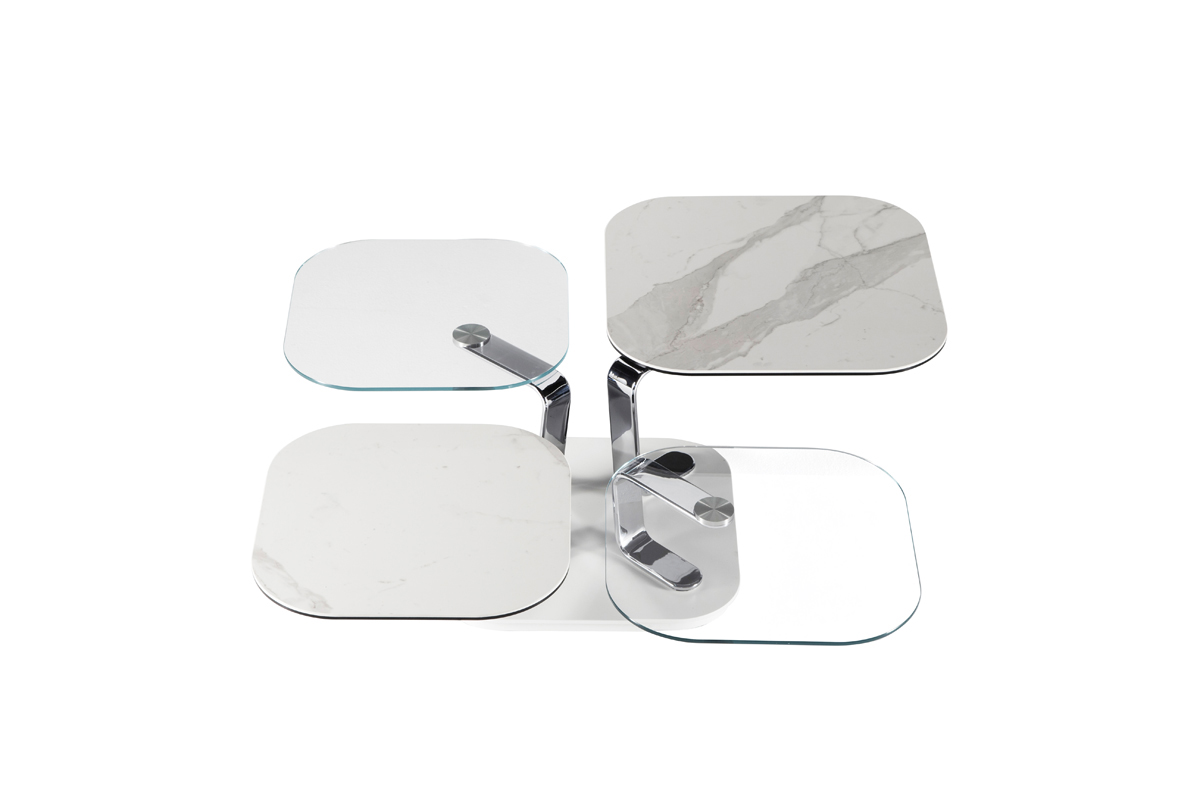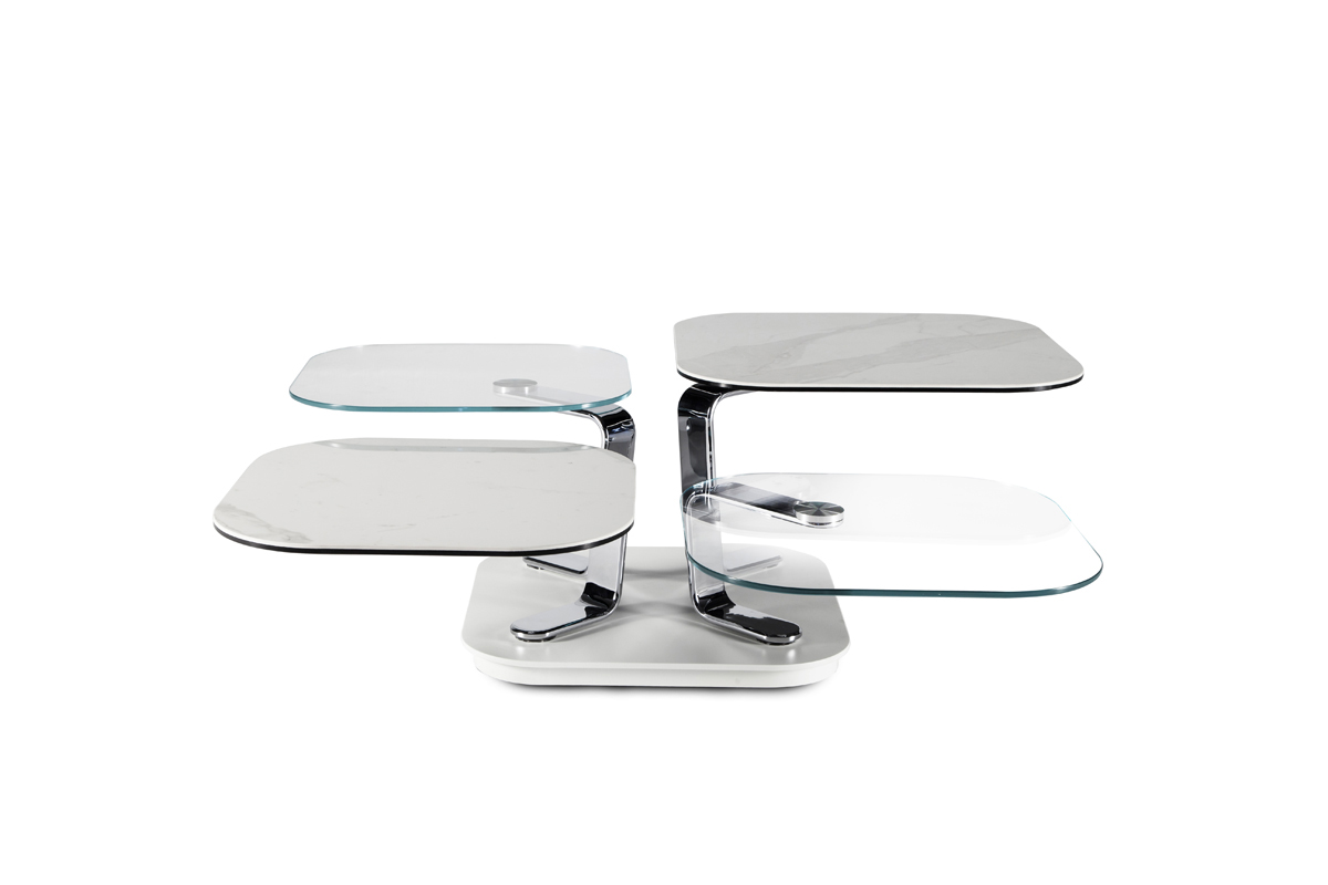 TAVOLINO ESTENSIBILE CON 4 PIANI IN CRISTALLO O CERAMICA. DOTATO DI UN INNOVATIVO DOPPIO MECCANISMO SINCRONIZZATO DI APERTURA CHE PERMETTE AI 4 CRISTALLI DI  APRIRSI CON UN SOLO GESTO MA IN DIREZIONI OPPOSTE.SUPPORTI IN ACCIAIO VERNICIATO O CROMATO.