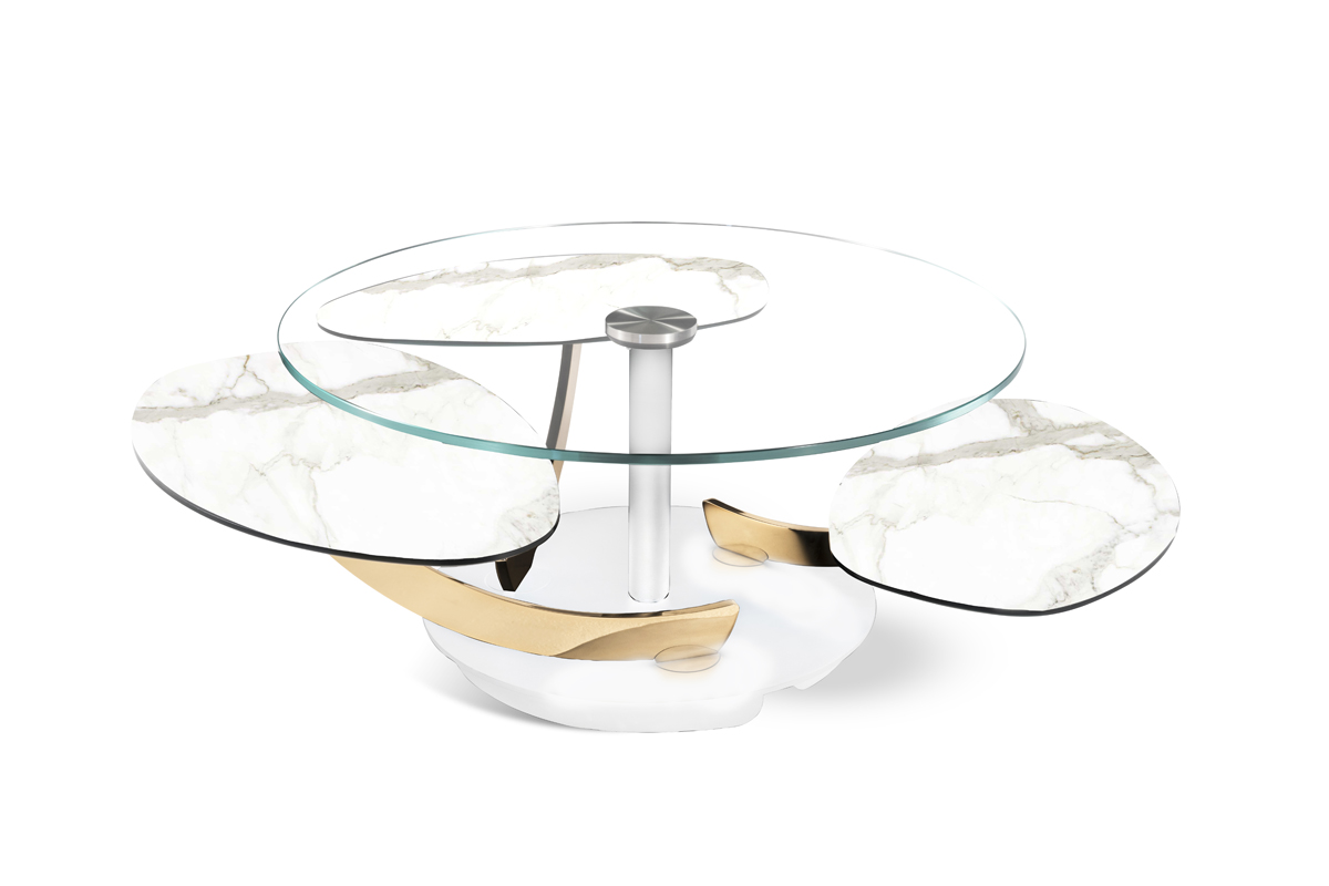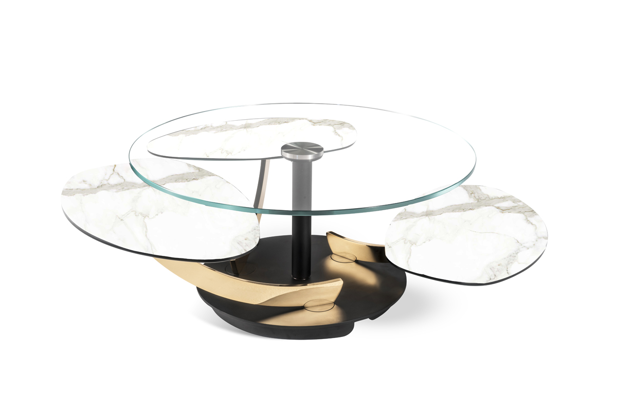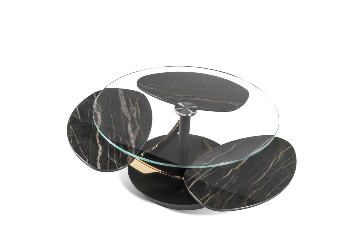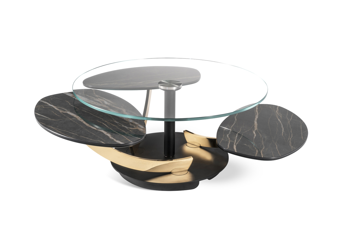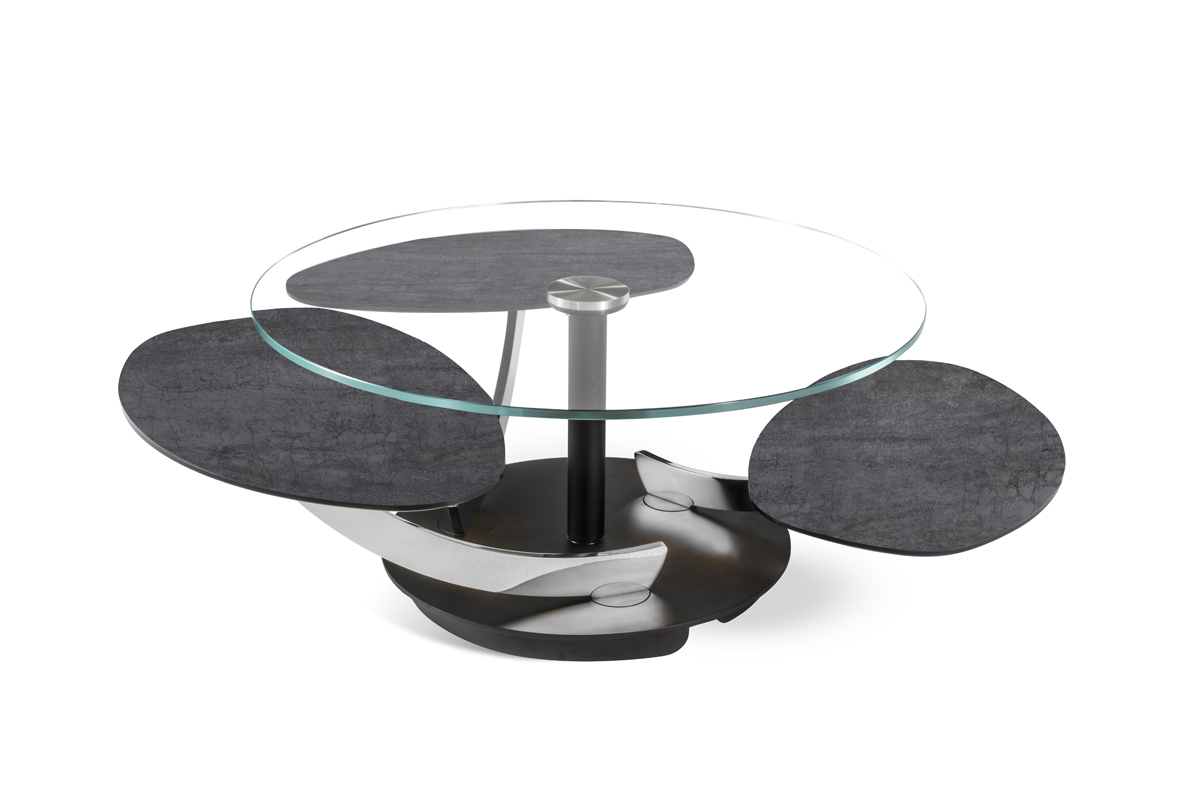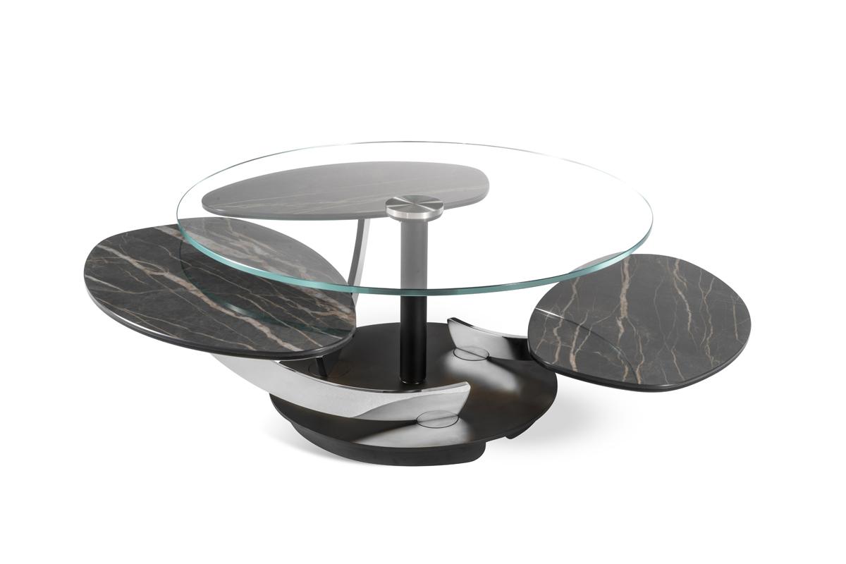 TAVOLINO ESTENSIBILE DOTATO DI UN INNOVATIVO MECCANISMO CHE, ATTRAVERSO LA SOLA  ROTAZIONE  DEL  PIANO SUPERIORE, PERMETTE AI TRE PIANETTI SOTTOSTANTI DI APRIRSI. IN POSIZIONE CHIUSA IL PIANO SUPERIORE NASCONDE I PIANI SOTTOSTANTI