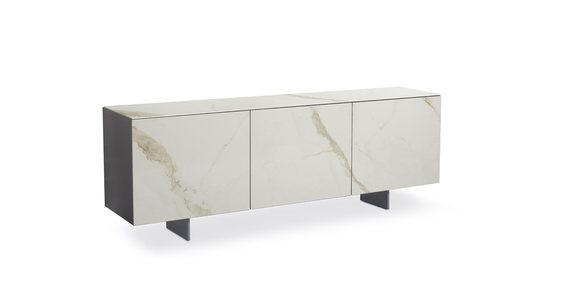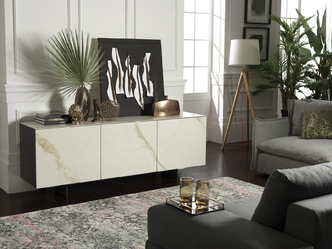 MADIA CONTENITORE 3 ANTE IN LEGNO CON RIVESTIMENTO PIANO SUPERIORE E ANTE IN CERAMICA. RIPIANI INTERNI IN CRISTALLO. CERNIERE CON APERTURA AUTOMATICA E BLOCCO IN CHIUSURA.