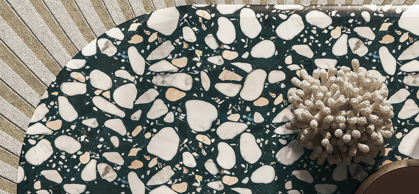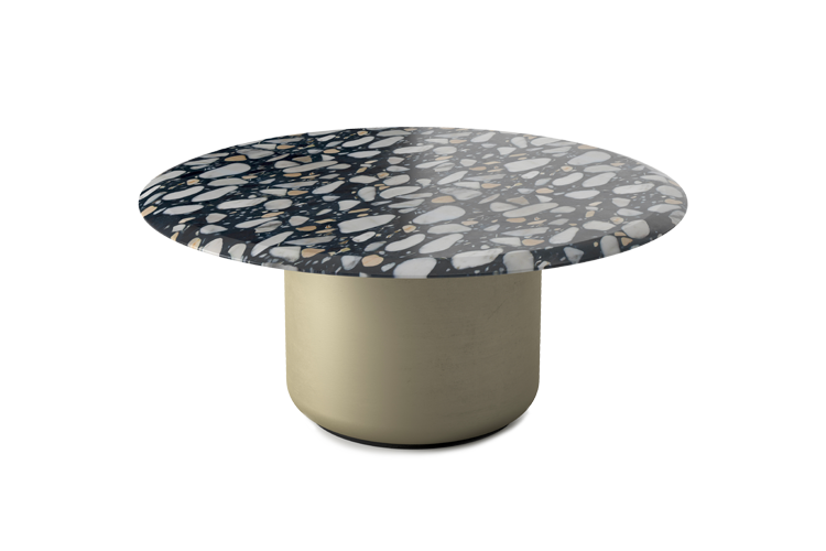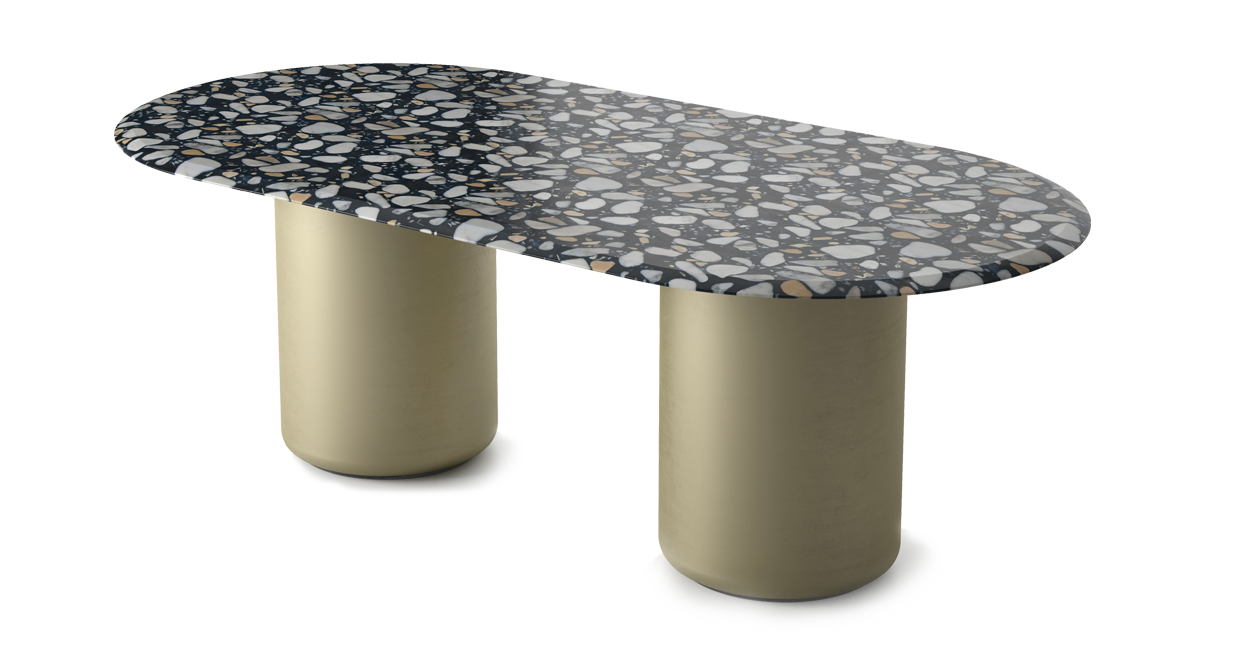 Voyage是一款造型蜿蜒的雕塑桌。有橢圓形和圓形兩種版本可供選擇,其特點(diǎn)是有兩個(gè)金屬包覆的淺金色啞光金屬單體基座。