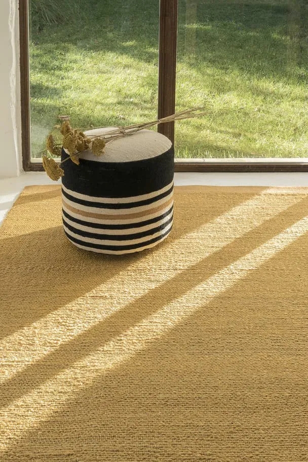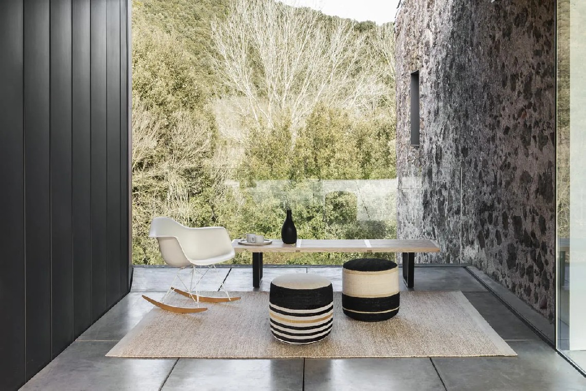 Aiming to transfer the warmth of the rug to other decorative elements has led to the creation of cylindrical poufs filled with flame-retardant padding inside a birch base, fully upholstered with geometric Kilims.