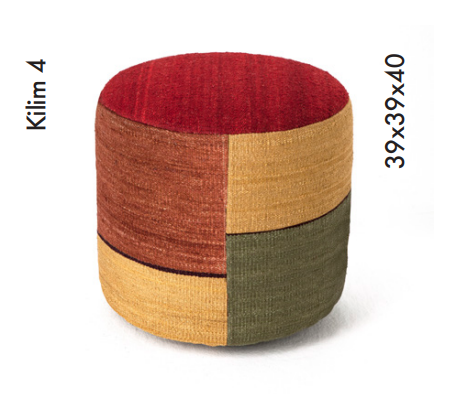 Aiming to transfer the warmth of the rug to other decorative elements has led to the creation of cylindrical poufs filled with flame-retardant padding inside a birch base, fully upholstered with geometric Kilims.