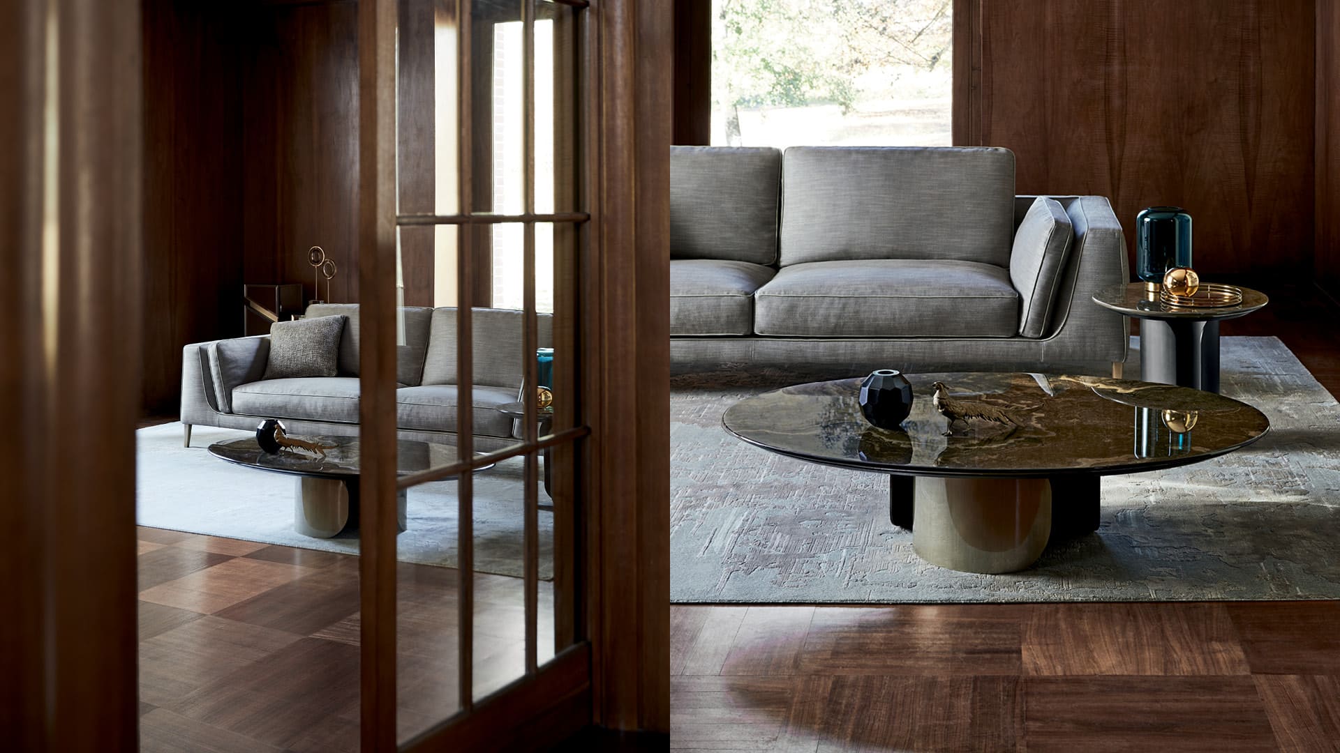 Il tavolino ovale con base in metallo Gabriel presenta un vivace contrasto materico tra la base metallica e il piano in pregiato marmo. La struttura cilindrica si apre su un lato per mostrare l’interno cavo.