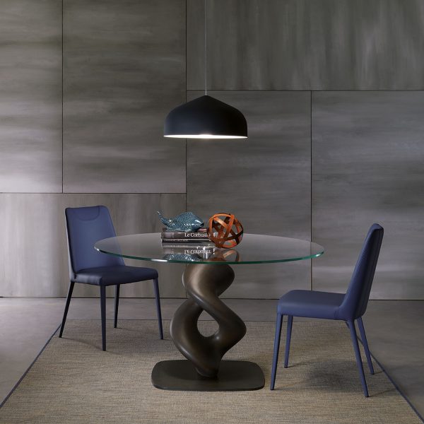 Tavolo da pranzo, base in metallo e poliuretano laccato, piano cristallo o vetro stratificato ceramica.