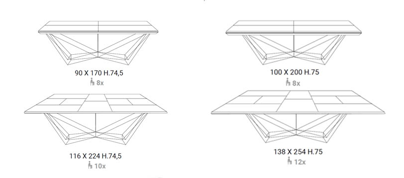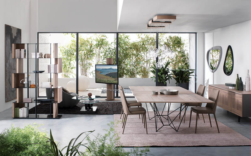 Tavolo da pranzo allungabile con piani e allunghe in legno o cemento, scorrimento guide metalliche. Basamento in tondino metallico.