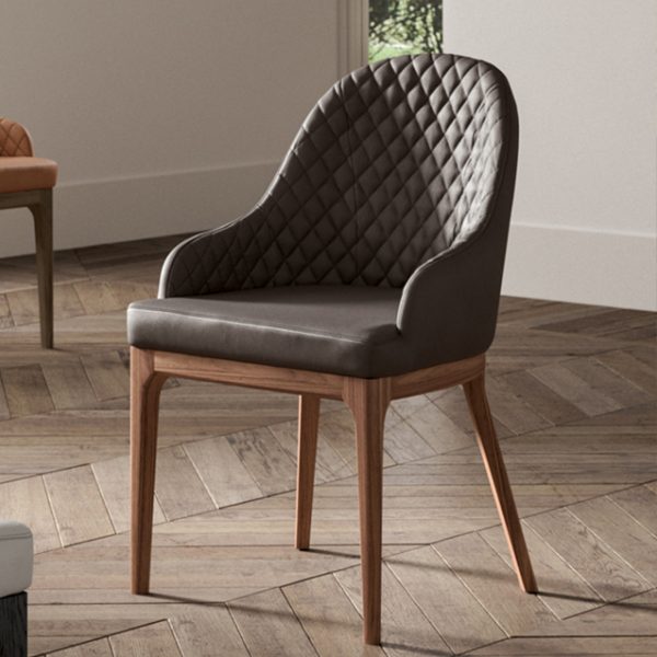 Poltroncina con seduta rivestita in pelle, eco pelle nabuk o velvet con interno trapuntato. Base in massello di frassino spazzolato.