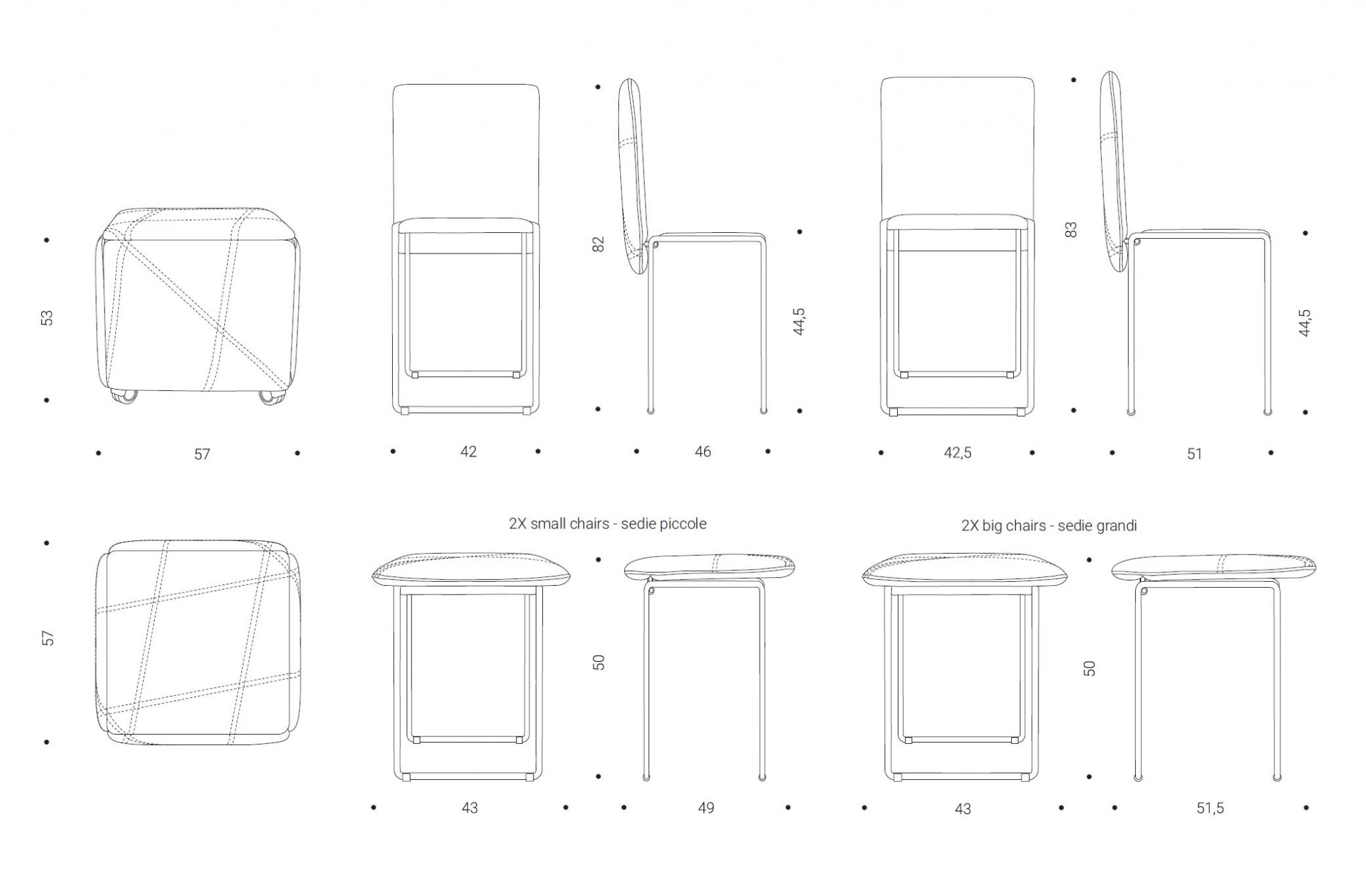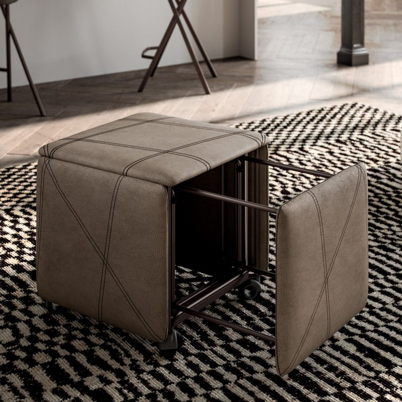 Sorprendente, trasformabile, indispensabile, sono solo alcuni degli aggettivi che descrivono al meglio questo innovativo complemento. L’avveniristico studio di intersezioni cela all’interno cinque sedute, quattro delle quali progettate per essere utilizzate come comode sedie dotate di poggia schiena imbottito. Articolo insostituibile per la praticità di utilizzo, dotato di quattro ruote per una facile movimentazione oltre che a elegante progetto di doppia cucitura per semplificare il riposizionamento in sede delle sedute.