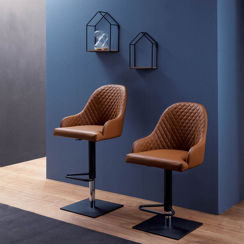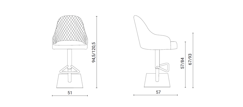 Sgabello con alzata a gas, basamento in metallo e seduta rivestita in pelle, velvet o eco pelle nabuk con interno trapuntato.