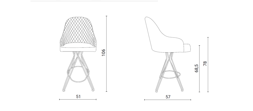 Sgabello fisso con basamento in filo metallico e seduta rivestita in pelle, velvet o eco pelle nabuk con interno trapuntato.