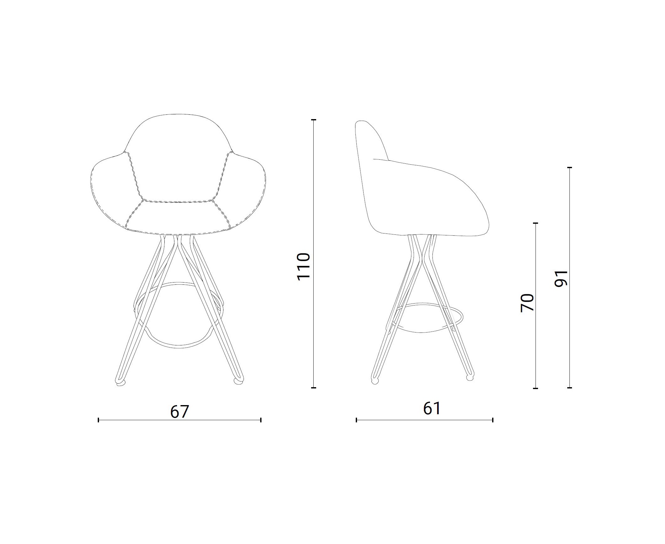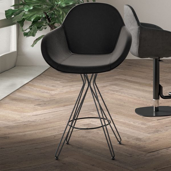 Sgabello fisso, basamento in filo metallico e seduta rivestita in pelle, eco pelle nabuk o velvet.