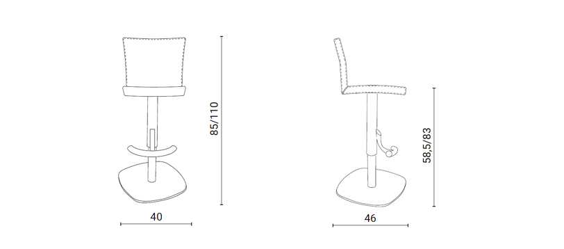 Sgabello con alzata a gas, basamento in metallo e seduta rivestita in pelle o eco pelle nabuk.