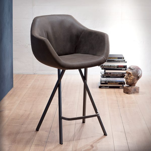 Sgabello fisso con basamento in metallo e seduta rivestita in pelle, eco pelle nabuk o velvet.