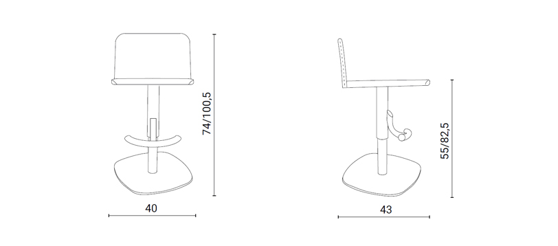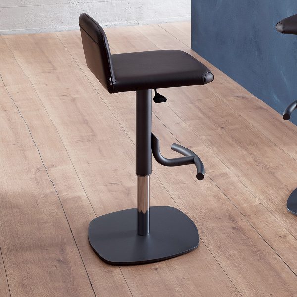 Sgabello con alzata a gas, basamento in metallo e seduta rivestita in pelle.