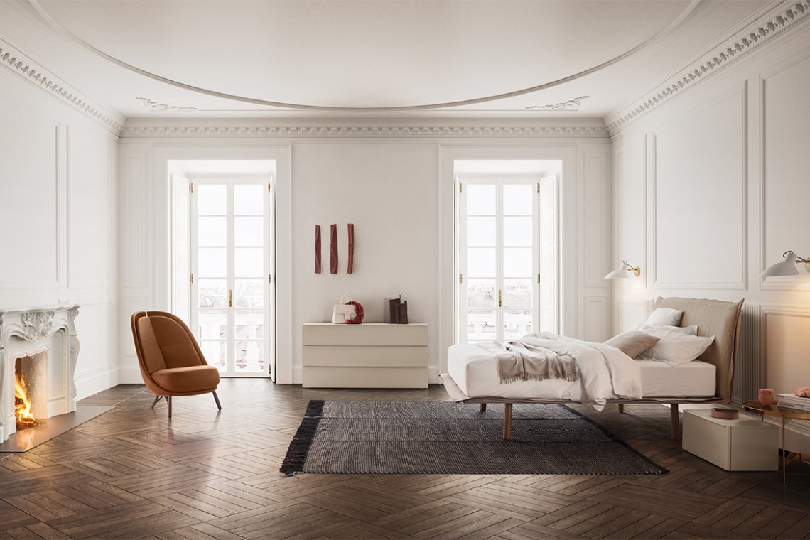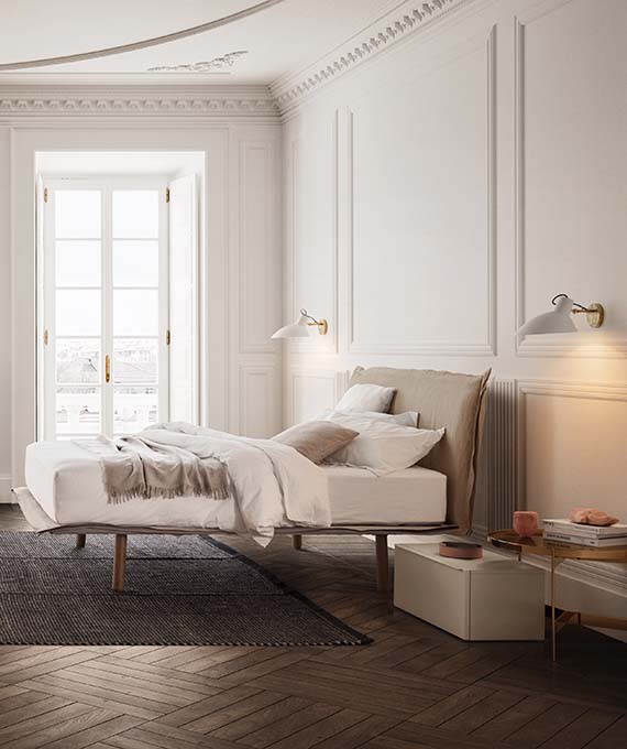 Touch of enchantment and magical charm expresses itself through sophisticated details. The soft, light lines of this design are reminiscent of a magic carpet. The edging – whose seam allowance is available in a customised, dual-coloured finish – creates a sinuous wave all around the bed. As desired, the bed base and headboard can be padded and upholstered in fabric, leather or man-made leather.