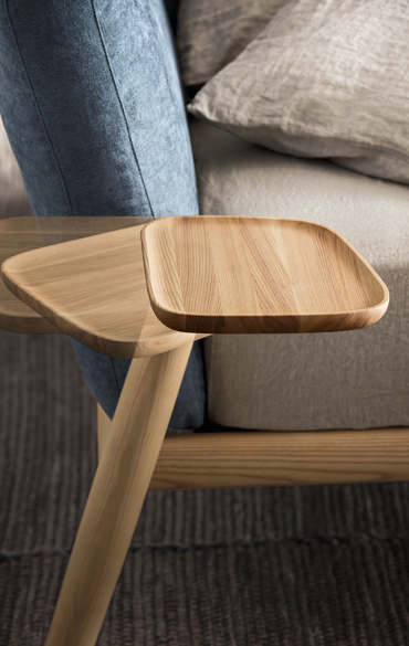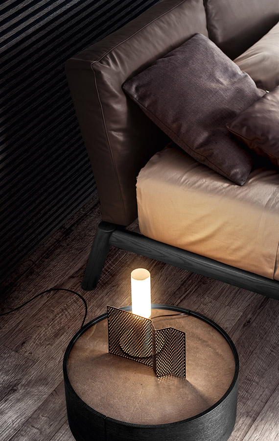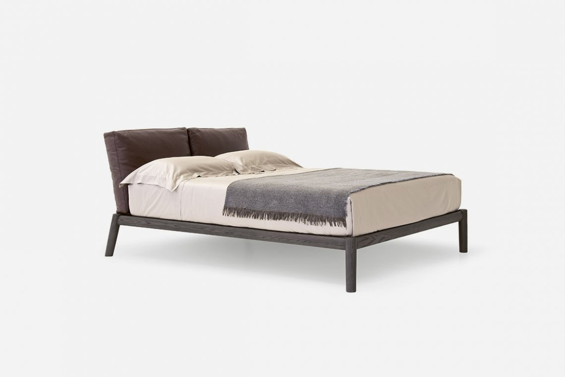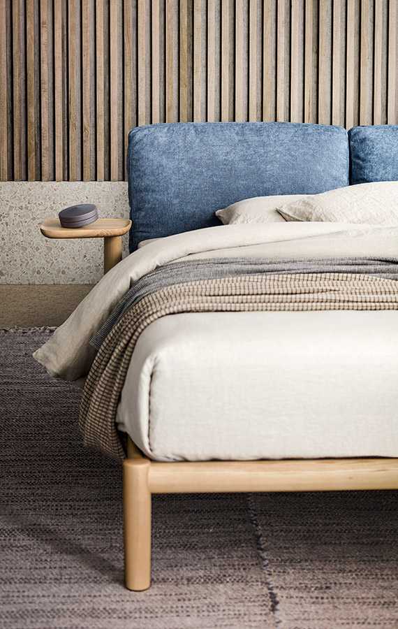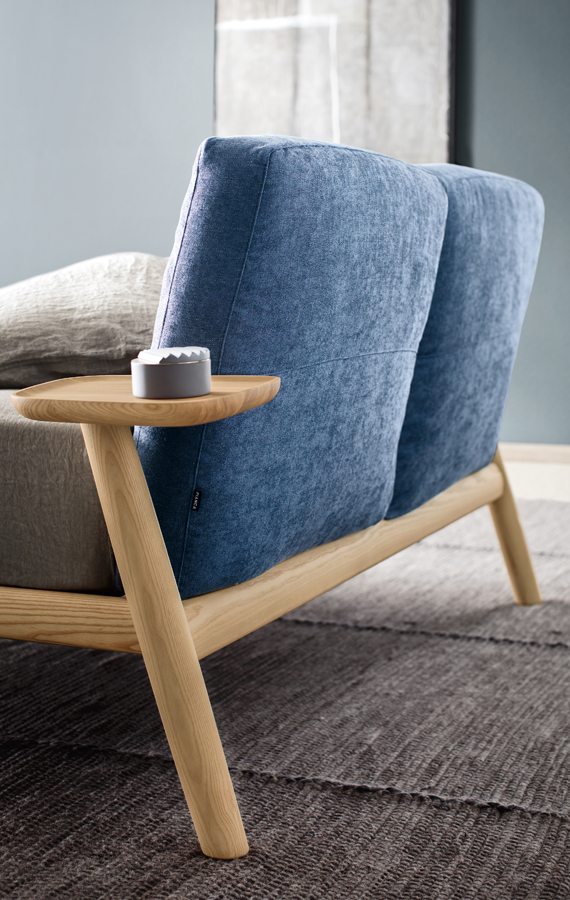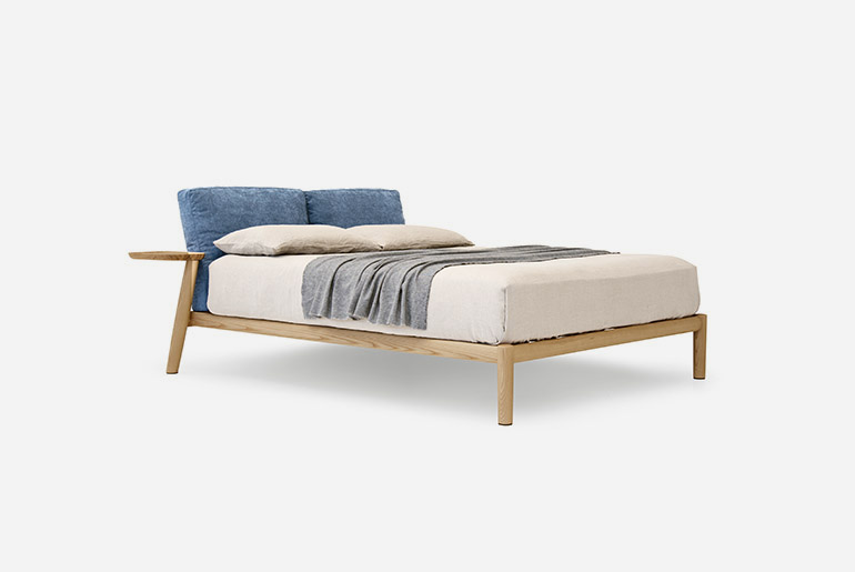 Predominant, convincing simplicity. Refinement expressed through detail that is tempting to touch. Handicraft workmanship applied to solid wood is paired with sturdy, tapered lines for a soft-touch design. The headboard boasts large, feather-filled cushions that create a soft headrest to relax on. The version with side tables features attractive, inclined, back legs that support practical, handy, rotating tops.